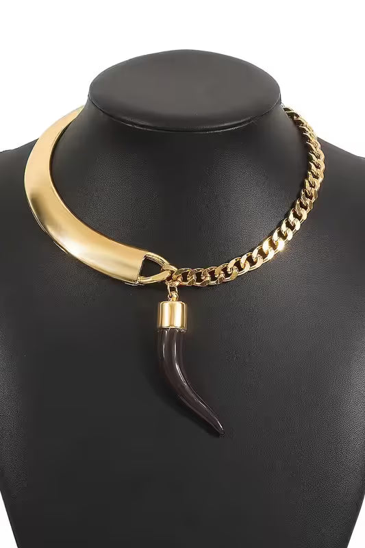 צ׳וקר ציפוי זהב נועז עם תליון קרן בצבע חום עמוק, משולב בשרשרת עבה ובחצי קולר מתכתי ליצירת מראה חזק ובולט.