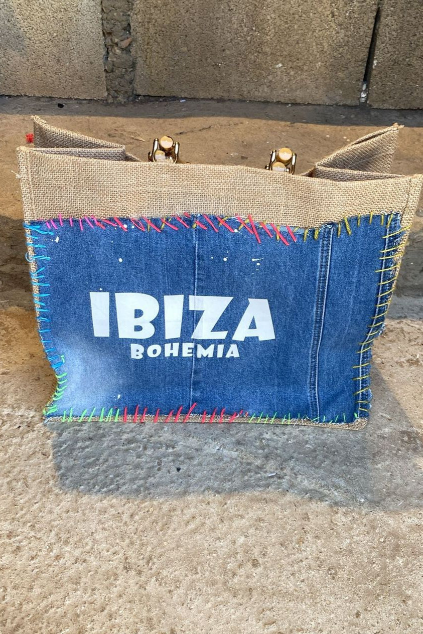 תיק יוטא עם ידיות דמוי עץ