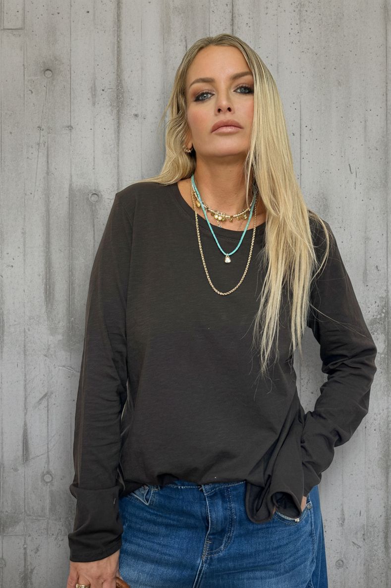 טי שירט ארוכת שרוול בגזרת אוברסייז משוחררת, עשויה מ־100% כותנה רכה ונעימה למגע.