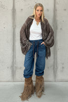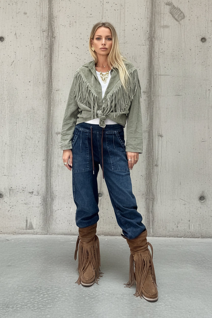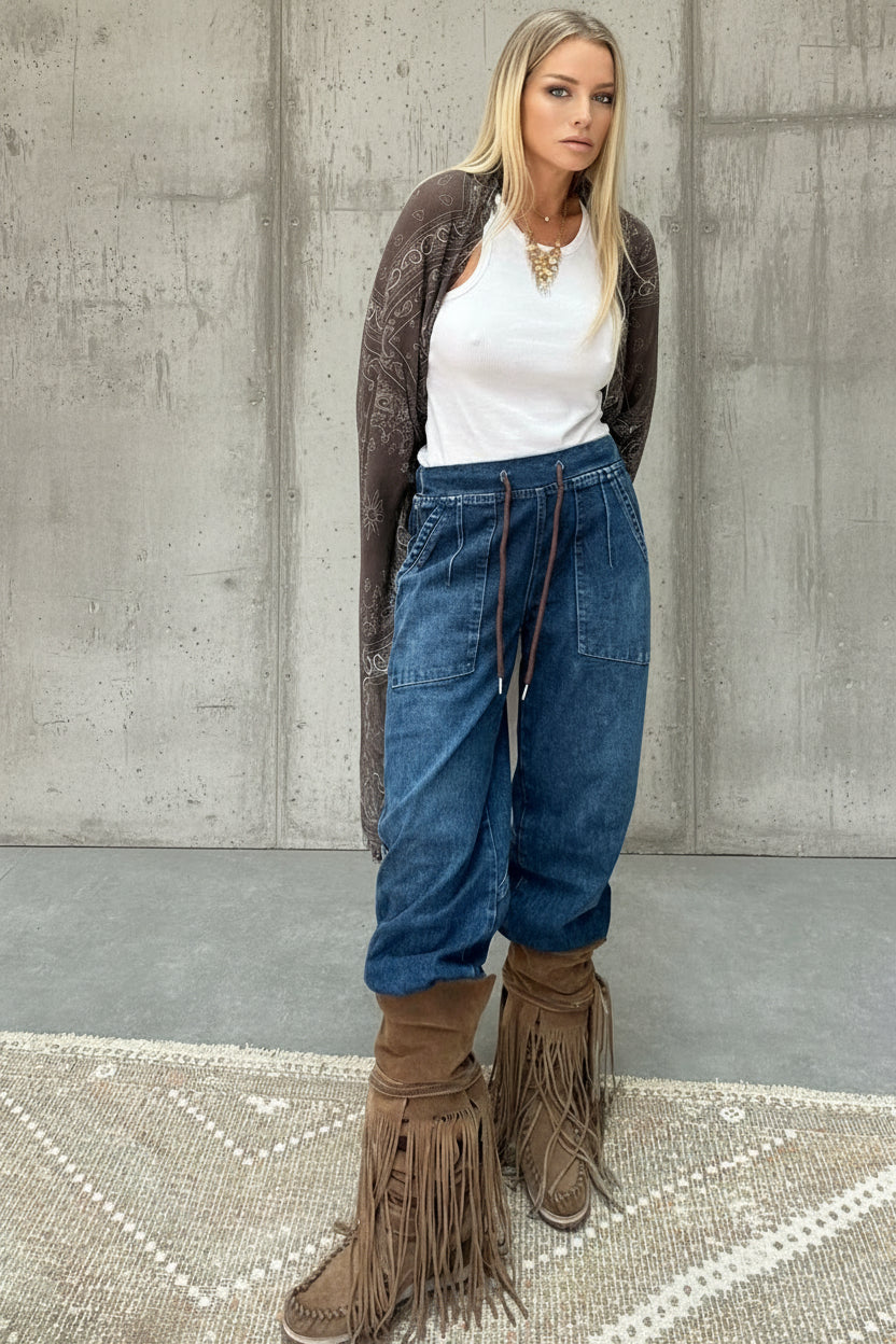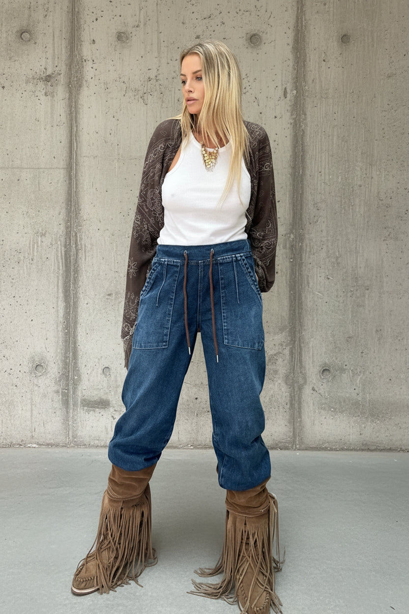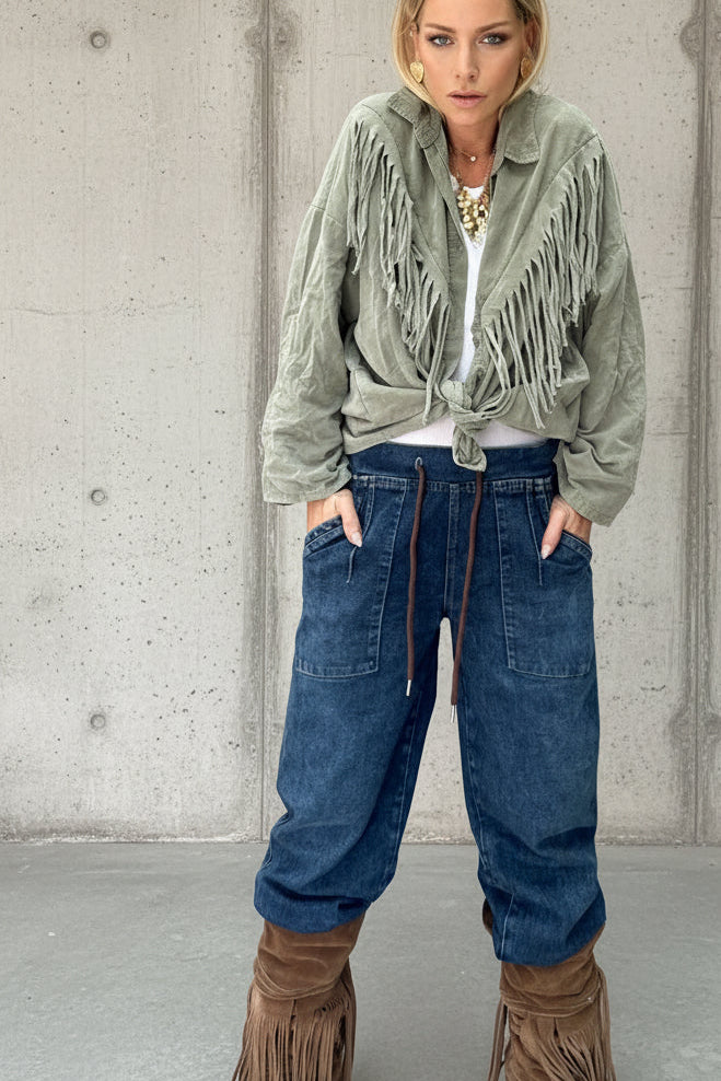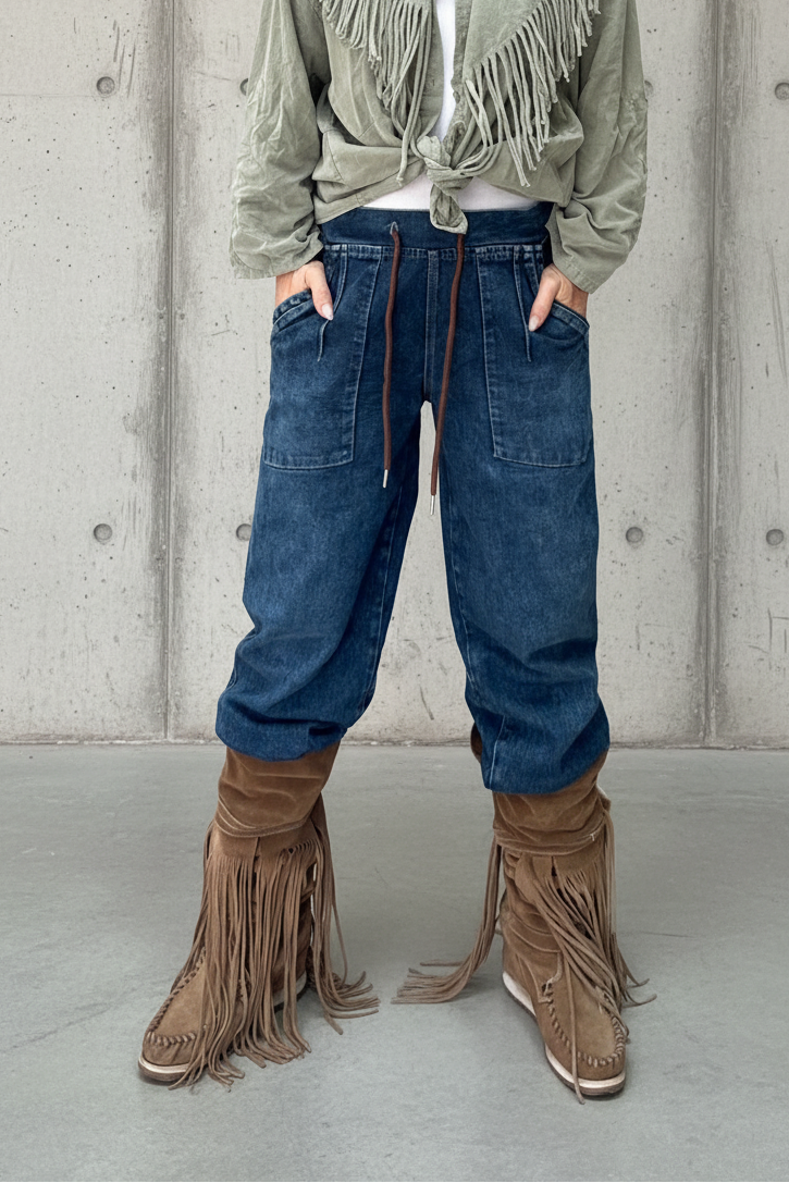 מכנס ג’ינס משוחרר בגזרה עדכנית ומחמיאה, עם כיסי-קארגו קדמיים שנותנים טאצ’ אורבני וקליל.