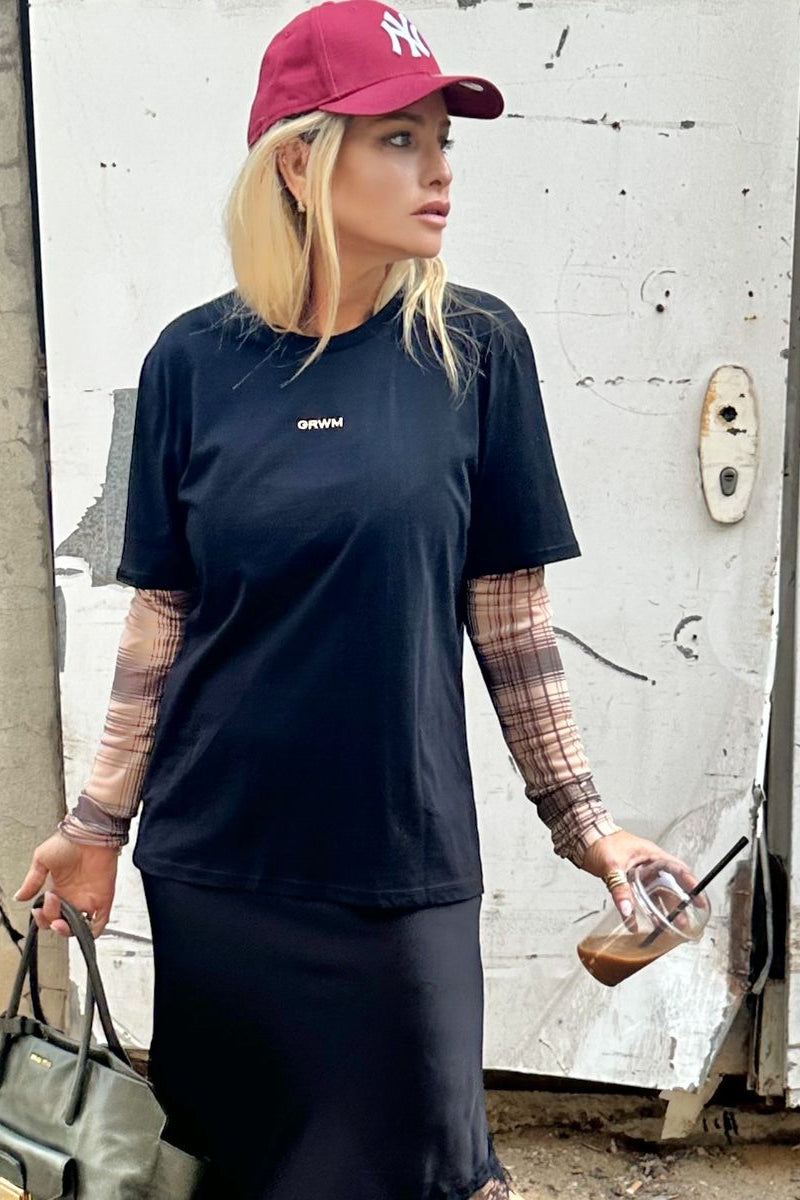 הדגם משלב מראה שכבות מתוחכם – טי שירט קצרה מעל שרוולים ארוכים בהדפס משבצות עדין, ליצירת לוק קז׳ואלי עם טוויסט אופנתי.