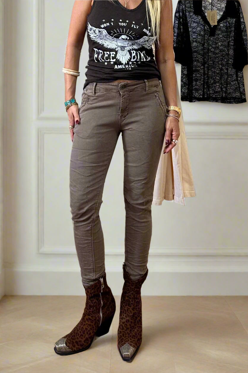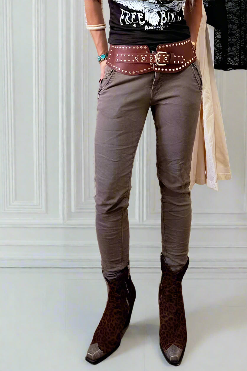 מכנס בגזרת סקיני גוןן חום מעושן,