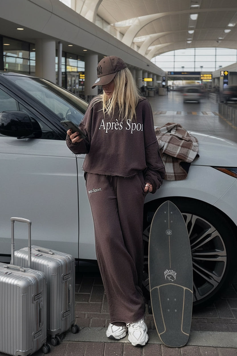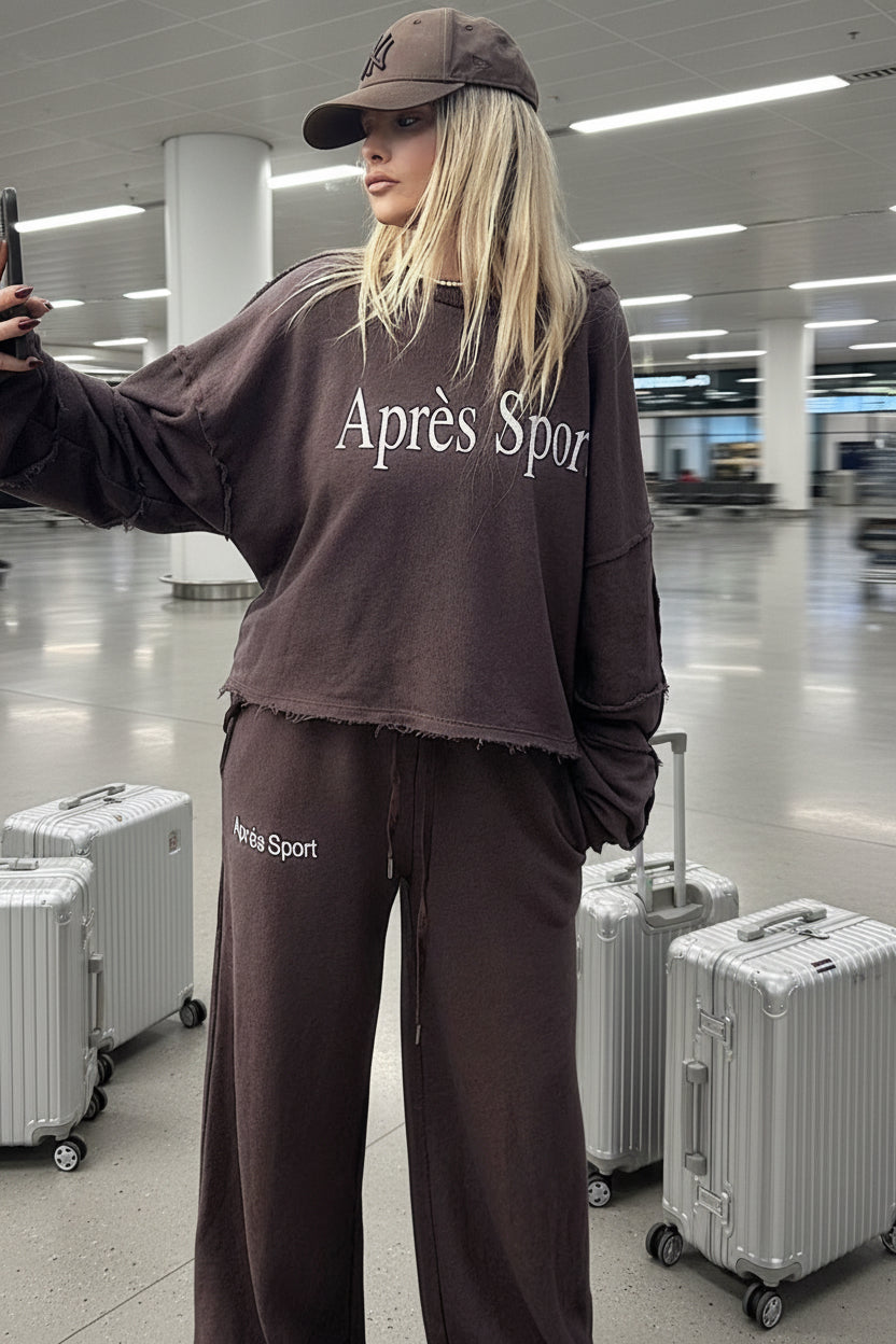הדפס Après Sport בחזית, קצוות פרומים ותפרים חיצוניים שנותנים מראה מודרני ואורבני.