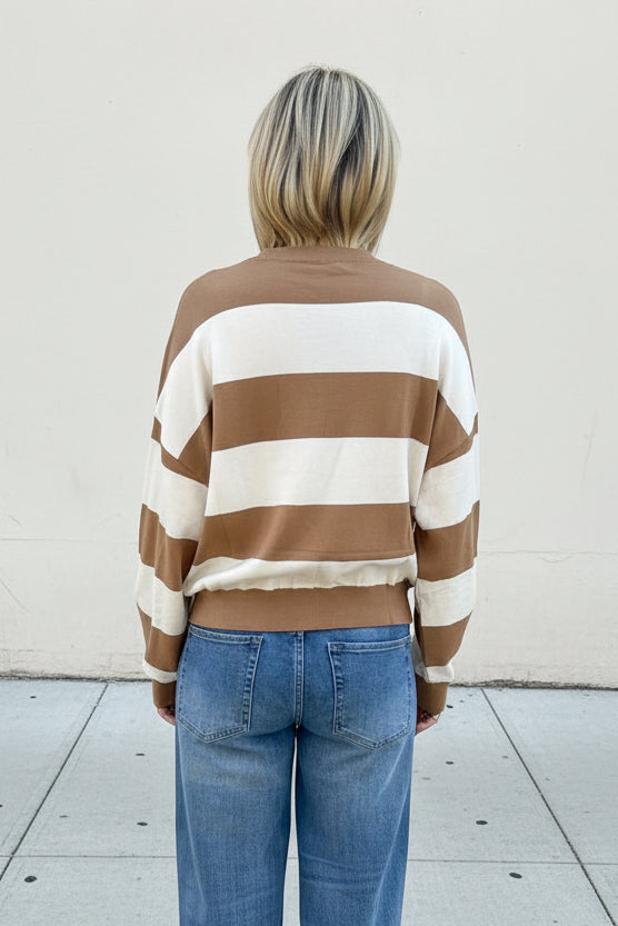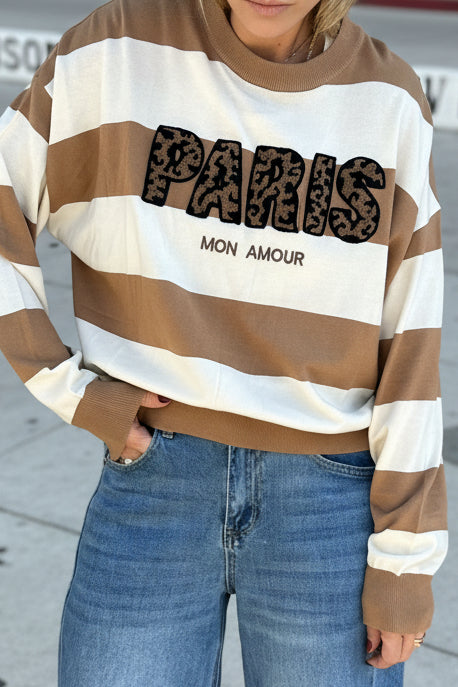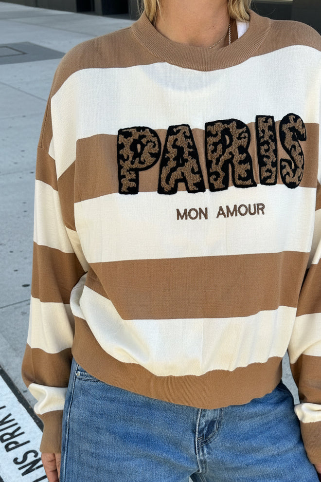 סריג פסים רחבים בסגנון צרפתי קלאסי, יחד עם כיתוב PARIS בטקסטורת רקמה פרוותית — שילוב מנצח של רומנטיקה וסטייטמנט.