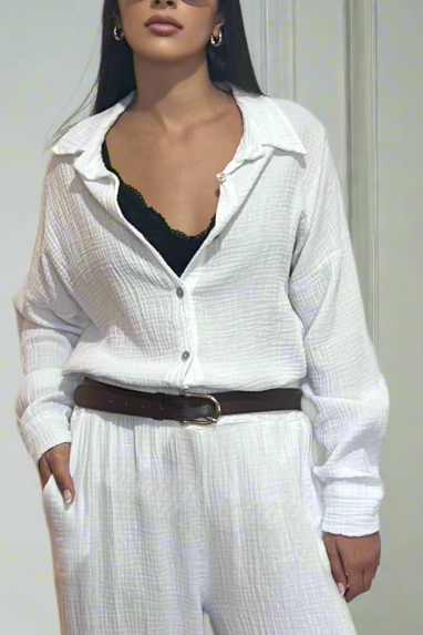 החולצה מגיעה עם צווארון קלאסי, כפתורים בחזית ושרוולים ארוכים עם אפשרות לקיפול לסטייל יומיומי. הבד הטקסטורלי מעניק מראה טבעי ורך, מושלם לשילוב עם חצאית, ג’ינס או שורטס ליצירת לוק קז’ואל-שיק אלגנטי