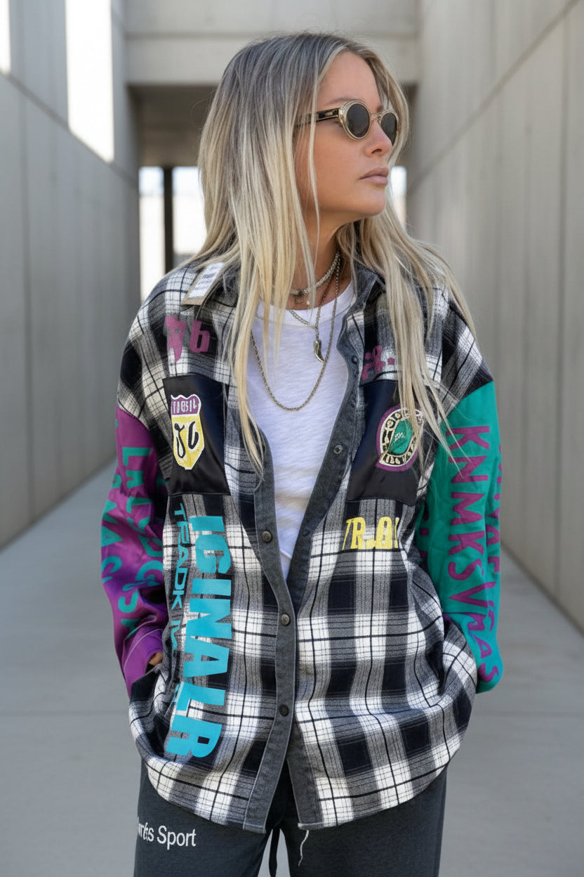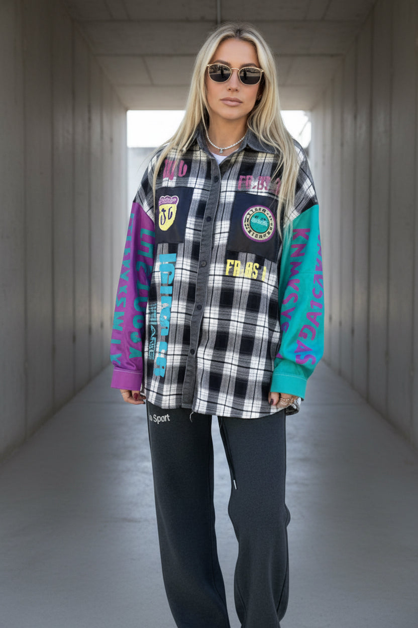 חולצת פלנל משובצת בגזרת אוברסייז עם פאצ’ים דקורטיביים בחזית.