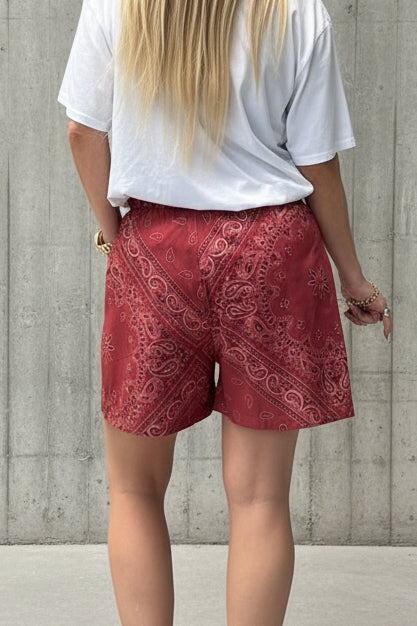 הפריט האולטימטיבי לקיץ קליל וסטייליסטי! שורטס בגזרה רפויה ונינוחה, עשוי בד דק ואוורירי עם הדפס בנדנה עדין בגוון בורדו טרנדי. גומי במותן לנוחות מקסימלית והתאמה מושלמת למבנה הגוף. מושלם לשילוב עם גופייה, טי-שירט קצרה או חולצה מכופתרת ללוק של חופש.