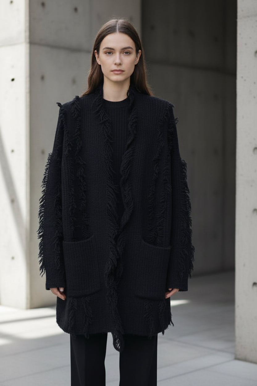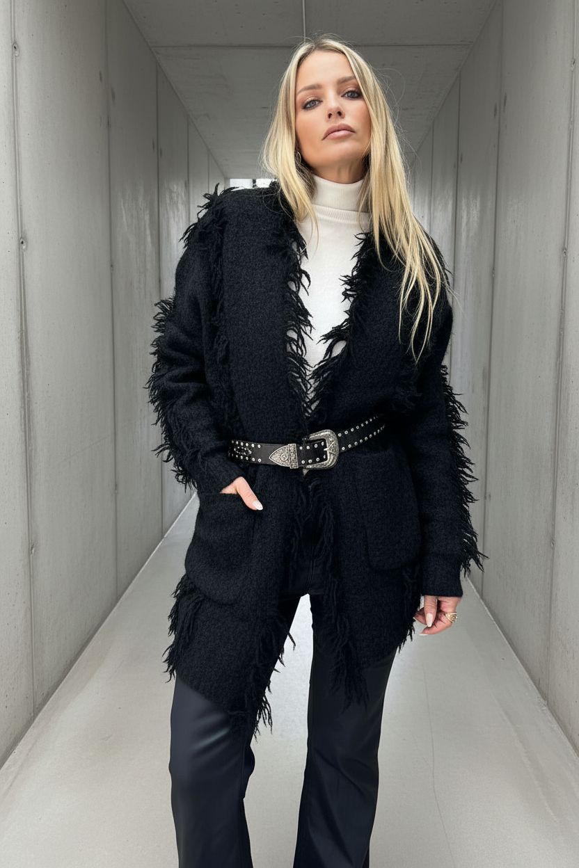 קרדיגן רך ונעים למגע בגזרת אוברסייז מחמיאה, עם נפילה טבעית בגימור פרנזים