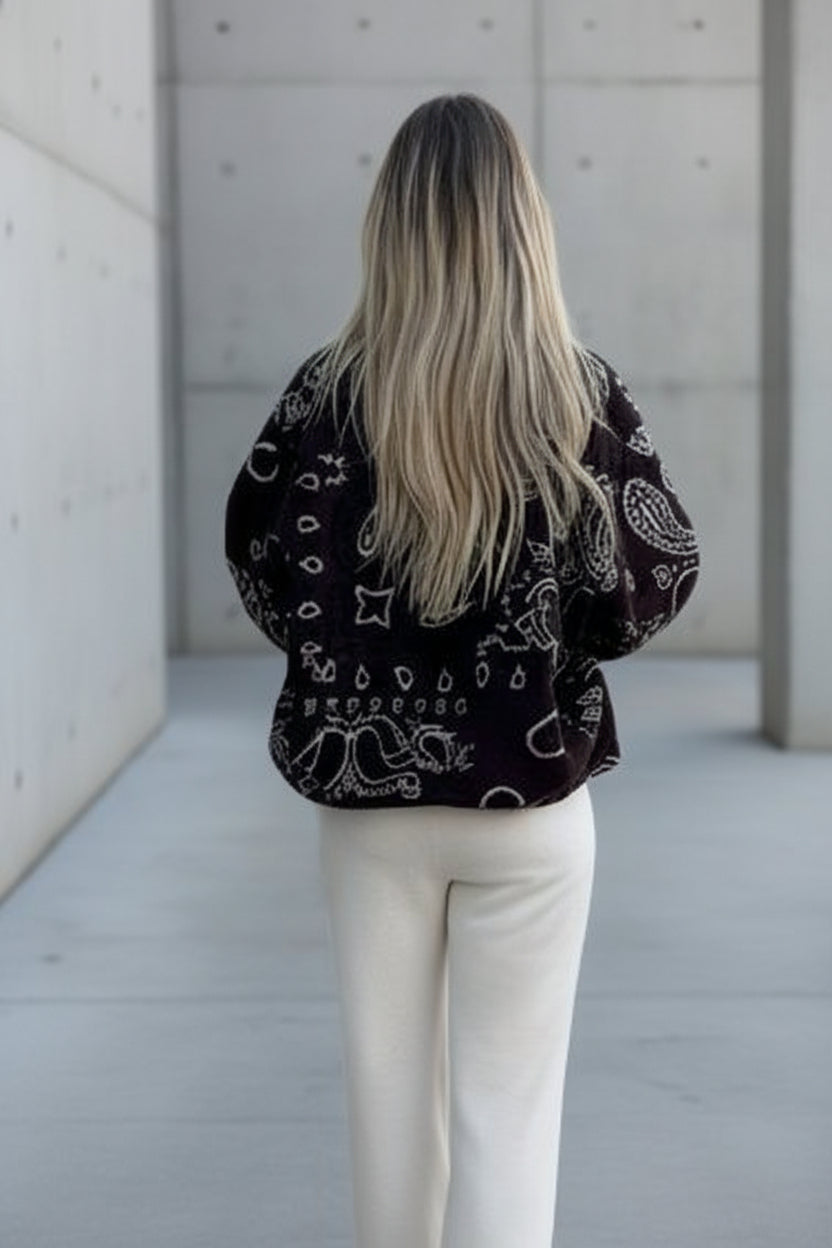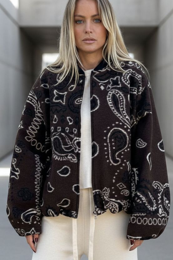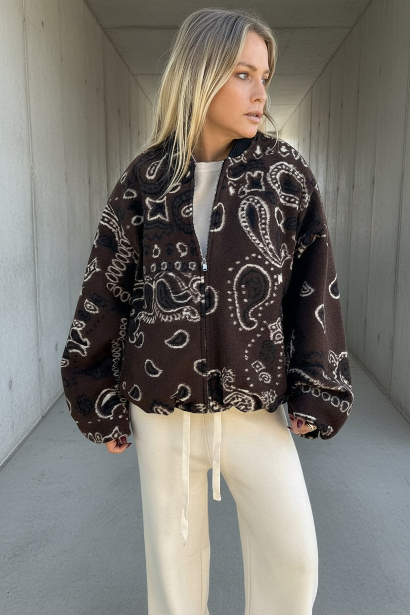 בומבר מבד צמרי רך ונעים בגזרת One Size, עם הדפס בנדנה ייחודי בגוון חום עמוק.