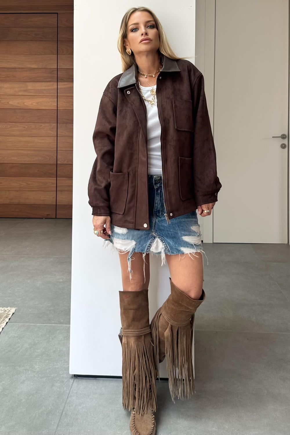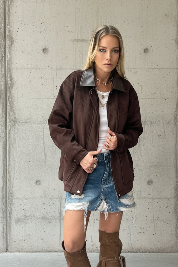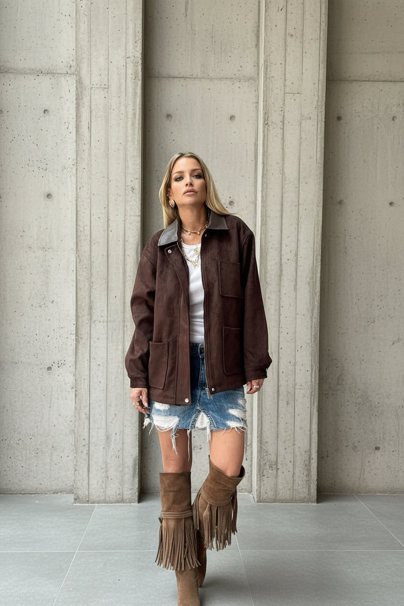ג׳קט זמש מפנק ורך למגע, בגזרת אוברסייז מחמיאה שמתאימה למידות S-L.