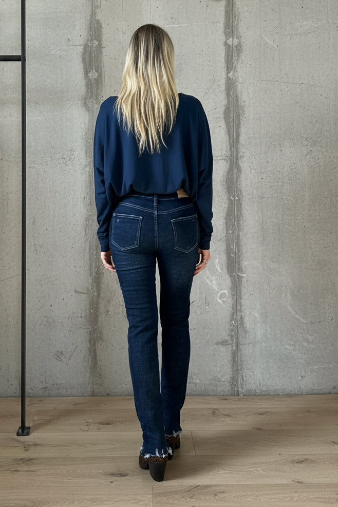 מגיע בגוון כחול קלאסי עם שטיפות קלות, כיסים אחוריים מעוצבים ותפרים מחמיאים שמאריכים את הרגליים.וכמובן חגורת גומי בחלק האחורי