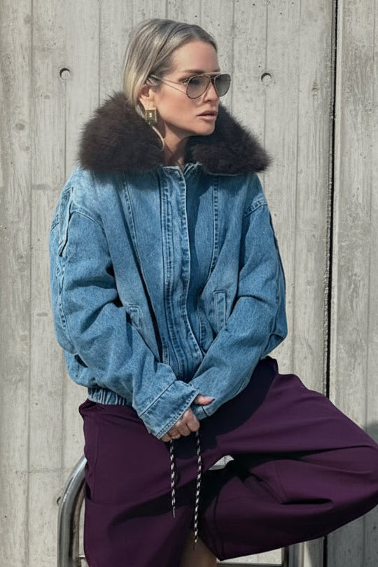 ג׳קט ג׳ינס ייחודי עם צווארון פרווה דרמטי ומגע יוקרתי.