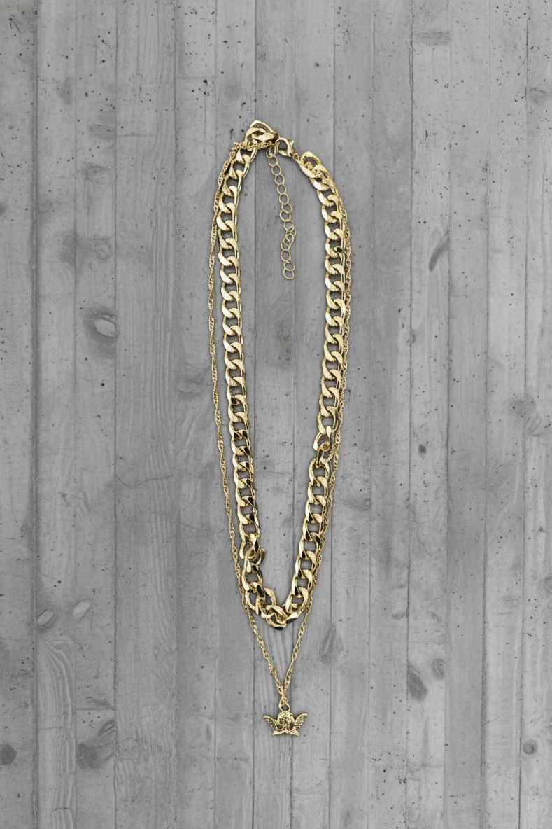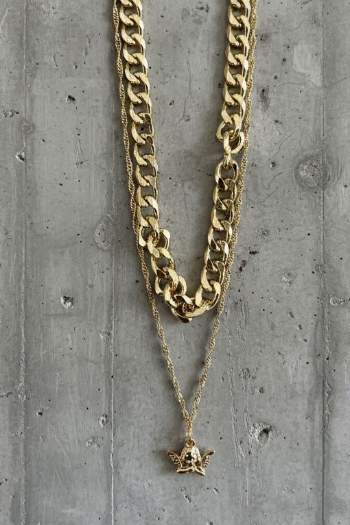 שרשרת שכבות מוזהבת בעלת שילוב של חוליות עבות ושרשרת דקה עם תליון מלאך עדין.