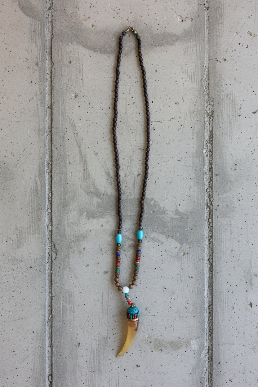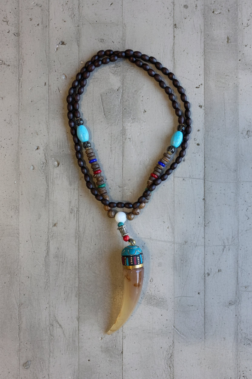 שרשרת בעבודת יד בסגנון אתני-בוהו, עשויה מחרוזי עץ כהים בשילוב חרוזי אבני חן צבעוניות (טורקיז, לבן, ירוק ואדום), עם תליון מרכזי בצורת שן/קרן מעוצבת בגווני ענבר חמים.