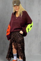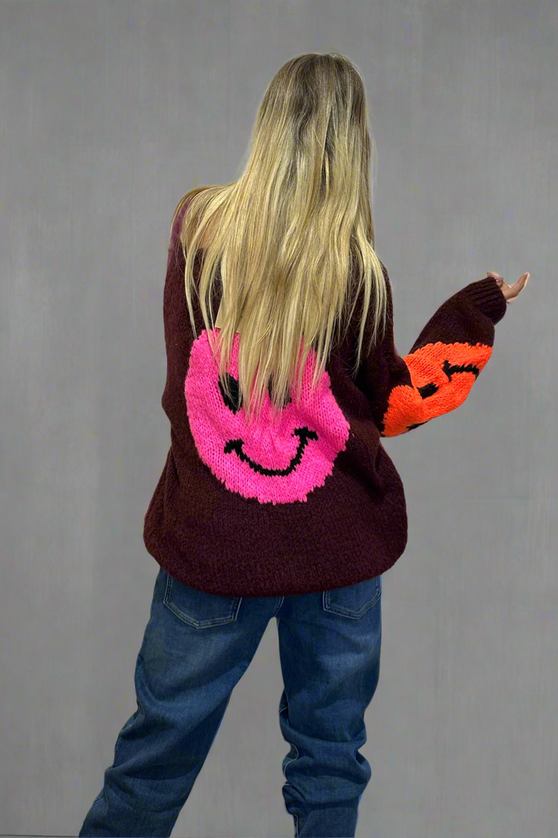 סריג אוברסייז בגוון בורדו עמוק, עם הדפסי סמיילי צבעוניים על השרוולים – אחד כתום לוהט והשני ירוק ניאון.