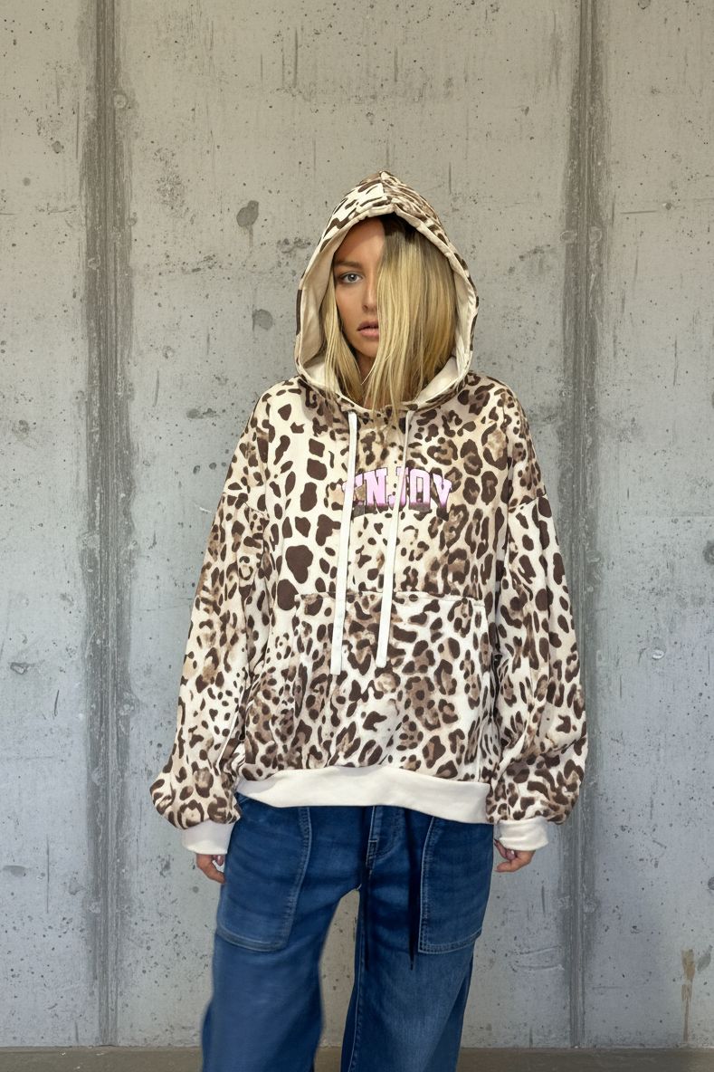 עשוי בד רך ונעים בגזרת אוברסייז, עם קפוצ’ון גדול וכיס קדמי רחב. ההדפס המנומר משתלב עם כיתוב ENJOY בוורוד פודרה, שיוצר מראה נועז אך נשי.