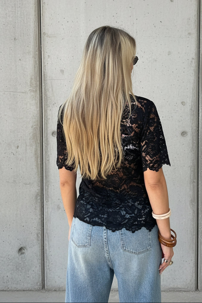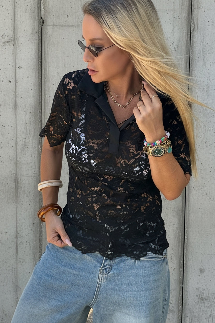 חולצת תחרה שחורה עם צווארון ושרוולים קצרים