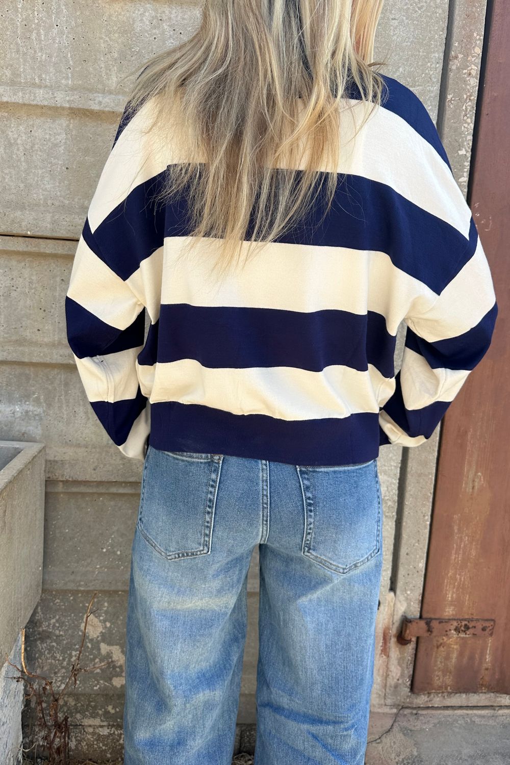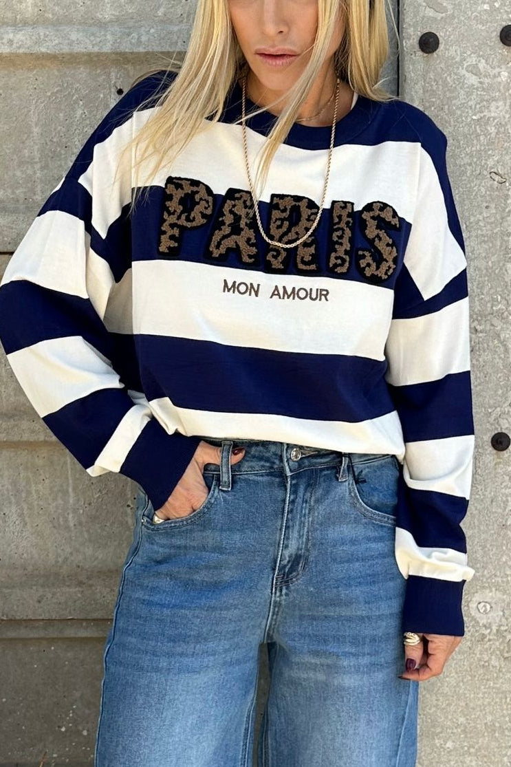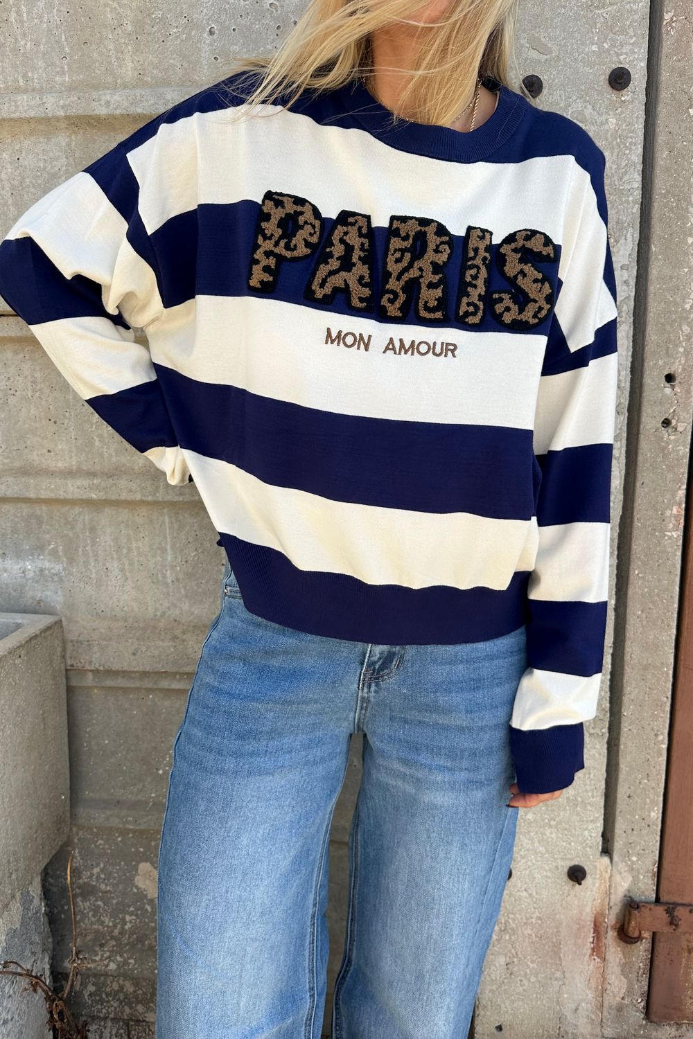 סריג פסים רחבים בסגנון צרפתי קלאסי, יחד עם כיתוב PARIS בטקסטורת רקמה פרוותית — שילוב מנצח של רומנטיקה וסטייטמנט.