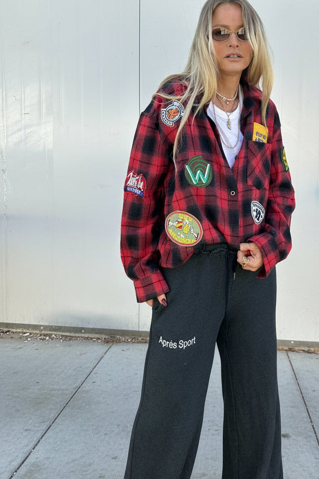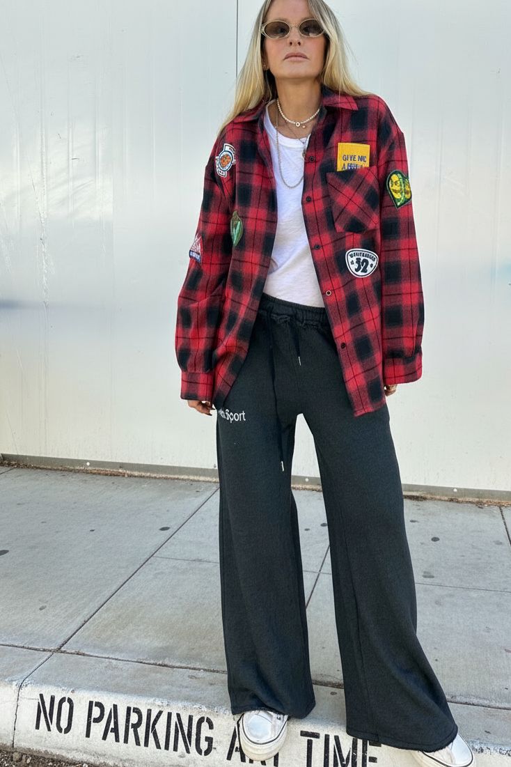 חולצת פלנל משובצת בגזרת אוברסייז עם פאצ’ים דקורטיביים בחזית.