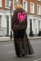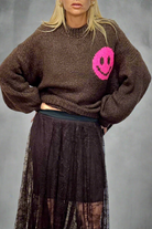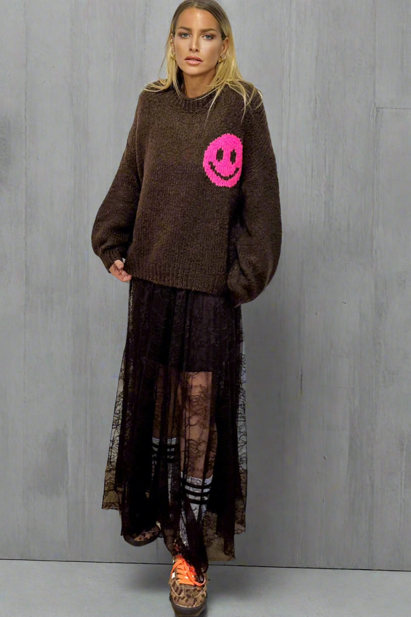 סריג אוברסייז רך ומחמם בגוון חום קפה, עם הדפס סמיילי גדול בצבע ורוד פלור המסמל שמחה ואנרגיה חיובית.
