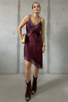 שמלת עשויה מבד סילקי רך עם מגע מלטף ונפילה טבעית, מעוטרת בתחרה עדינה במחשוף ובשוליים בגזרה אלכסונית שמעניקה לה מראה מתוחכם ומחמיא.