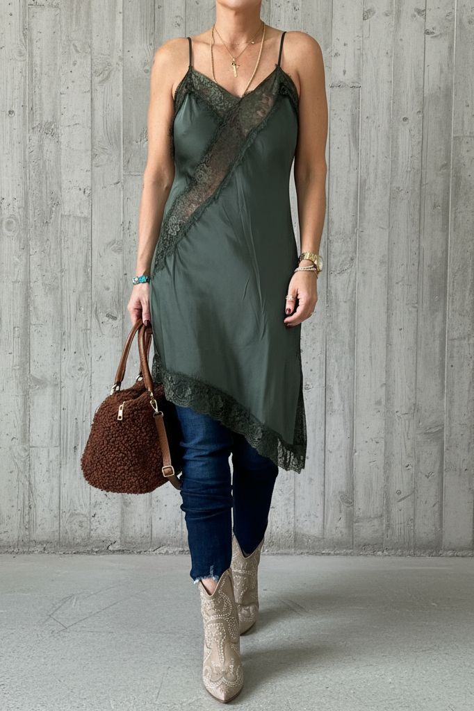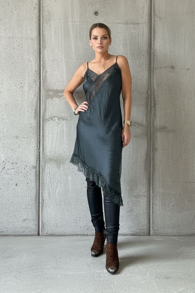 שמלת עשויה מבד סילקי רך עם מגע מלטף ונפילה טבעית, מעוטרת בתחרה עדינה במחשוף ובשוליים בגזרה אלכסונית שמעניקה לה מראה מתוחכם ומחמיא.