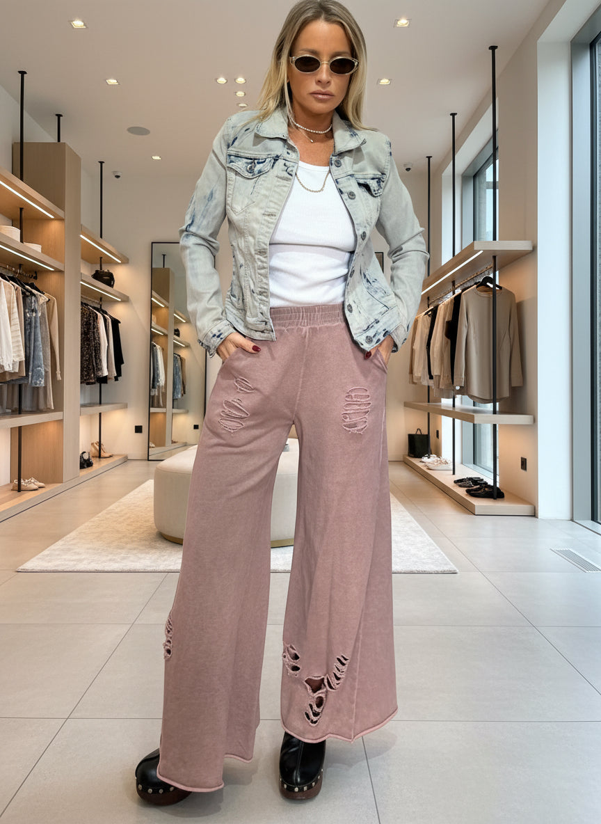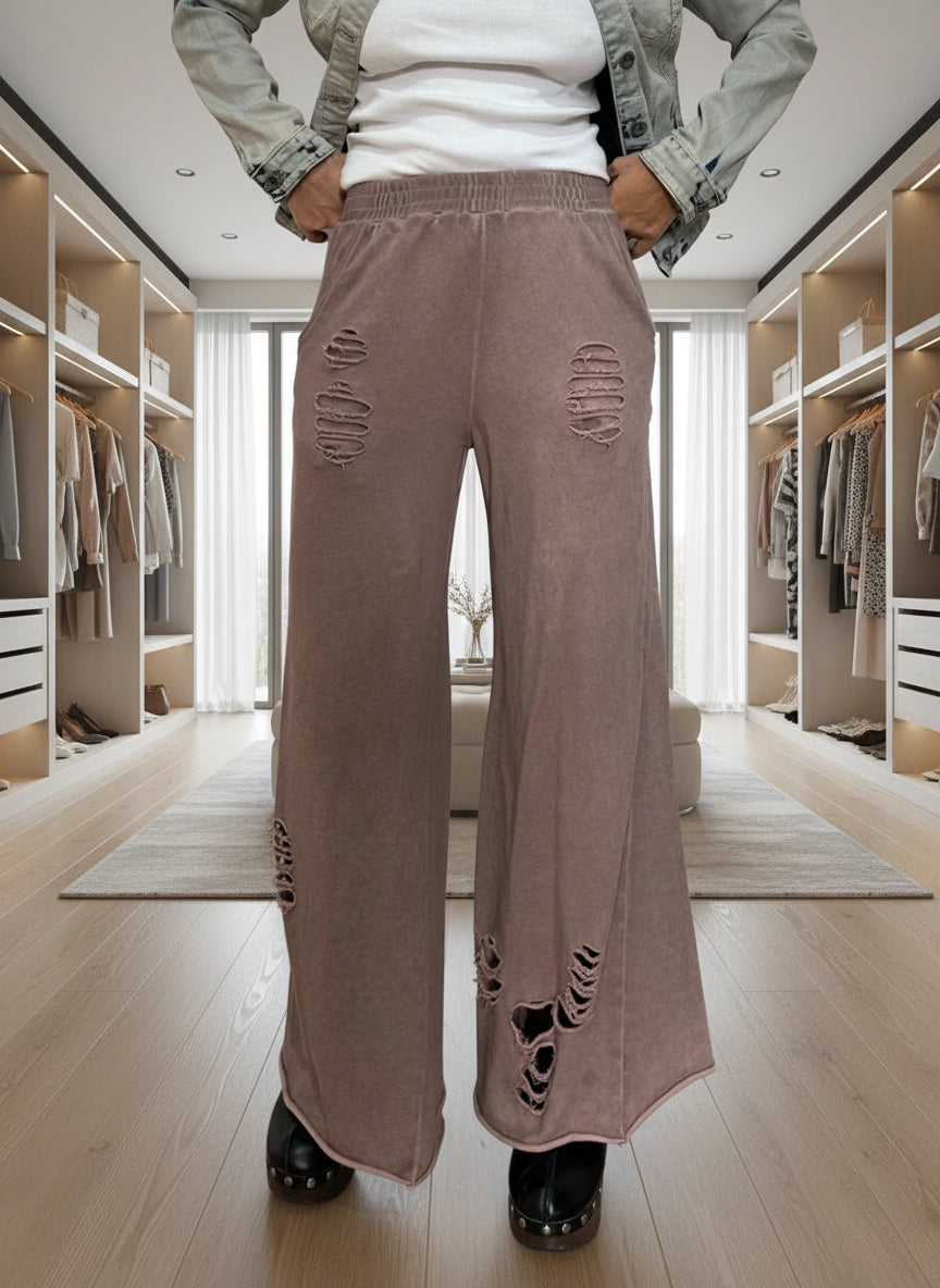 מכנס טרנינג ייחודי עם קרעים מעוצבים בלוק וינטג’ בוהו־אורבני מדויק.