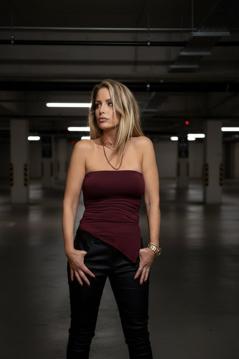 טופ סטרפלס מחמיא ומדויק, עשוי מבד אלסטי איכותי שנמתח ומתלבש בצורה מושלמת על הגוף. הגזרה צמודה ומעצבת, עם חלק תחתון אלכסוני שמאריך את קו הגוף ויוצר מראה נשי, מחוטב וסטייליסטי. מתאים למידות 34–40 בזכות הגמישות של הבד.