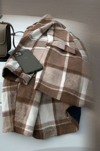 בדוגמת חום-לבן, בגזרה ישרה ונוחה. עשוי מבד צמרי מעט