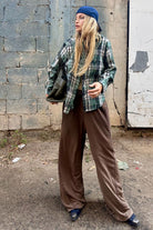 מכנס טרנינג בגוון חום מוקה בגזרה משוחררת ונינוחה, מבד נעים עם ברק עדין שמעניק מראה אלגנטי ולא מתאמץ.