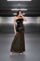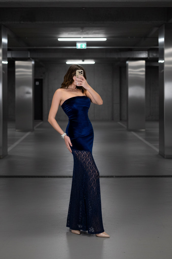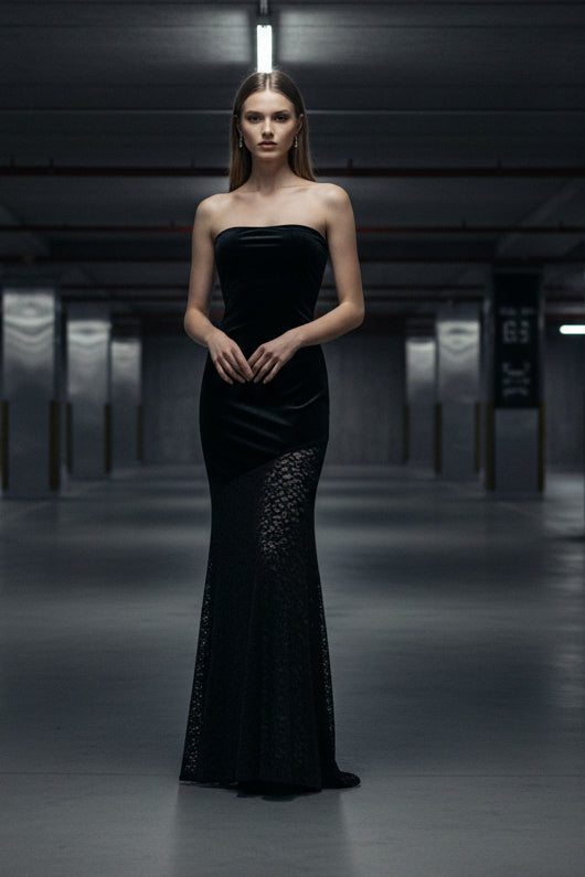 שמלת סטרפלס מבד קטיפה רך בשילוב תחרה עבה ונשפכת בחלקה התחתון.