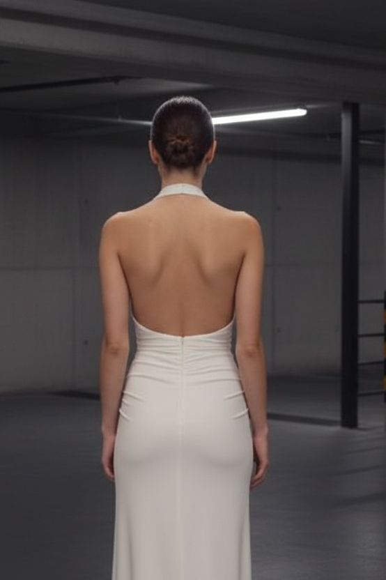 מפתח הולטר עמוק עם כיווץ עדין בחזית יוצר דגש מחמיא באזור החזה והמותן, והגזרה הארוכה מעניקה מראה אלגנטי וזורם.