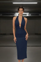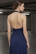 מפתח הולטר עמוק עם כיווץ עדין בחזית יוצר דגש מחמיא באזור החזה והמותן, והגזרה הארוכה מעניקה מראה אלגנטי וזורם.