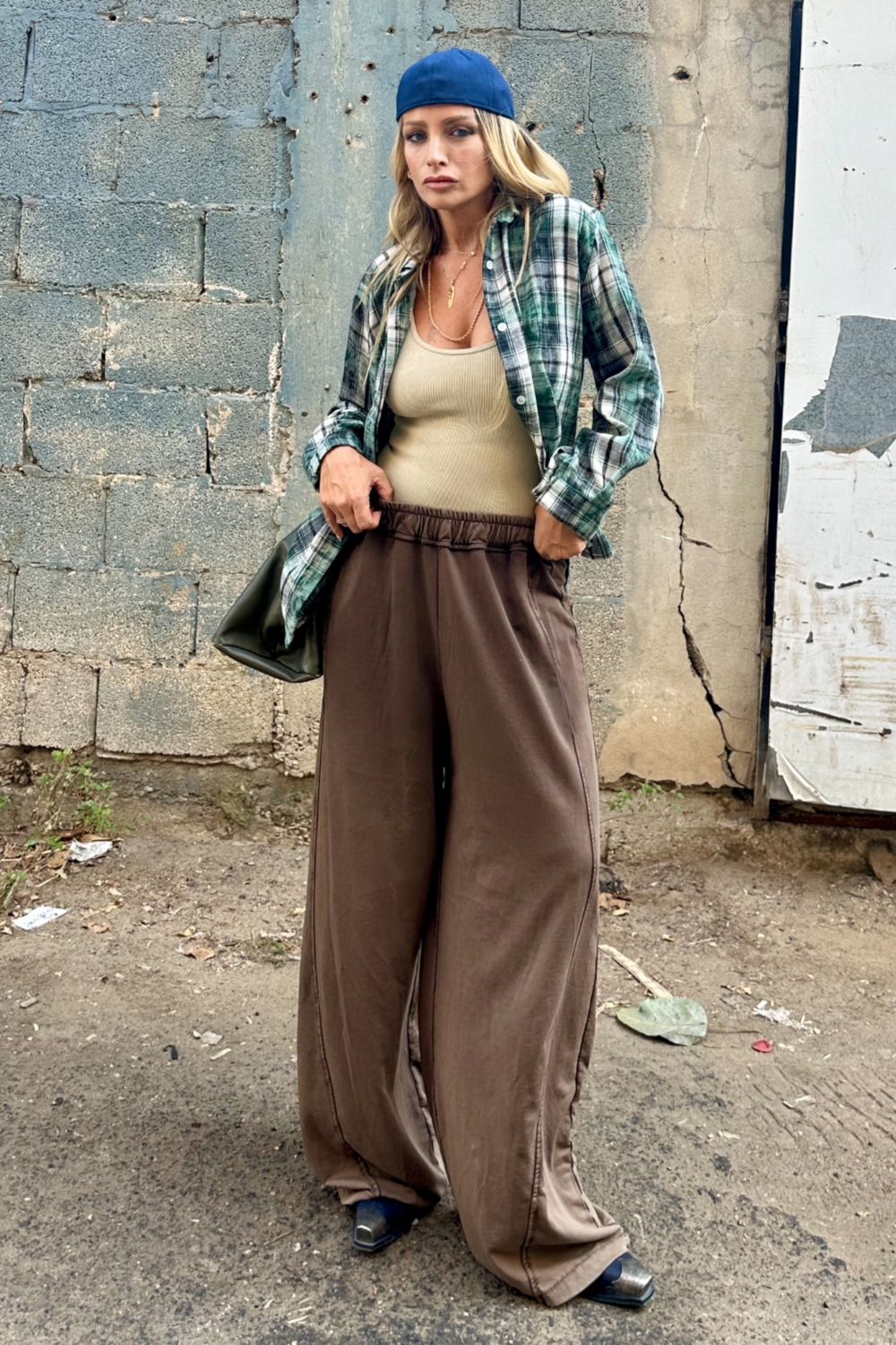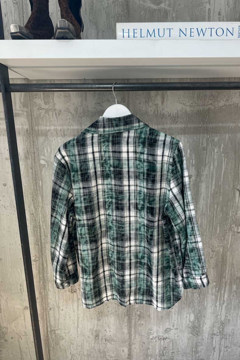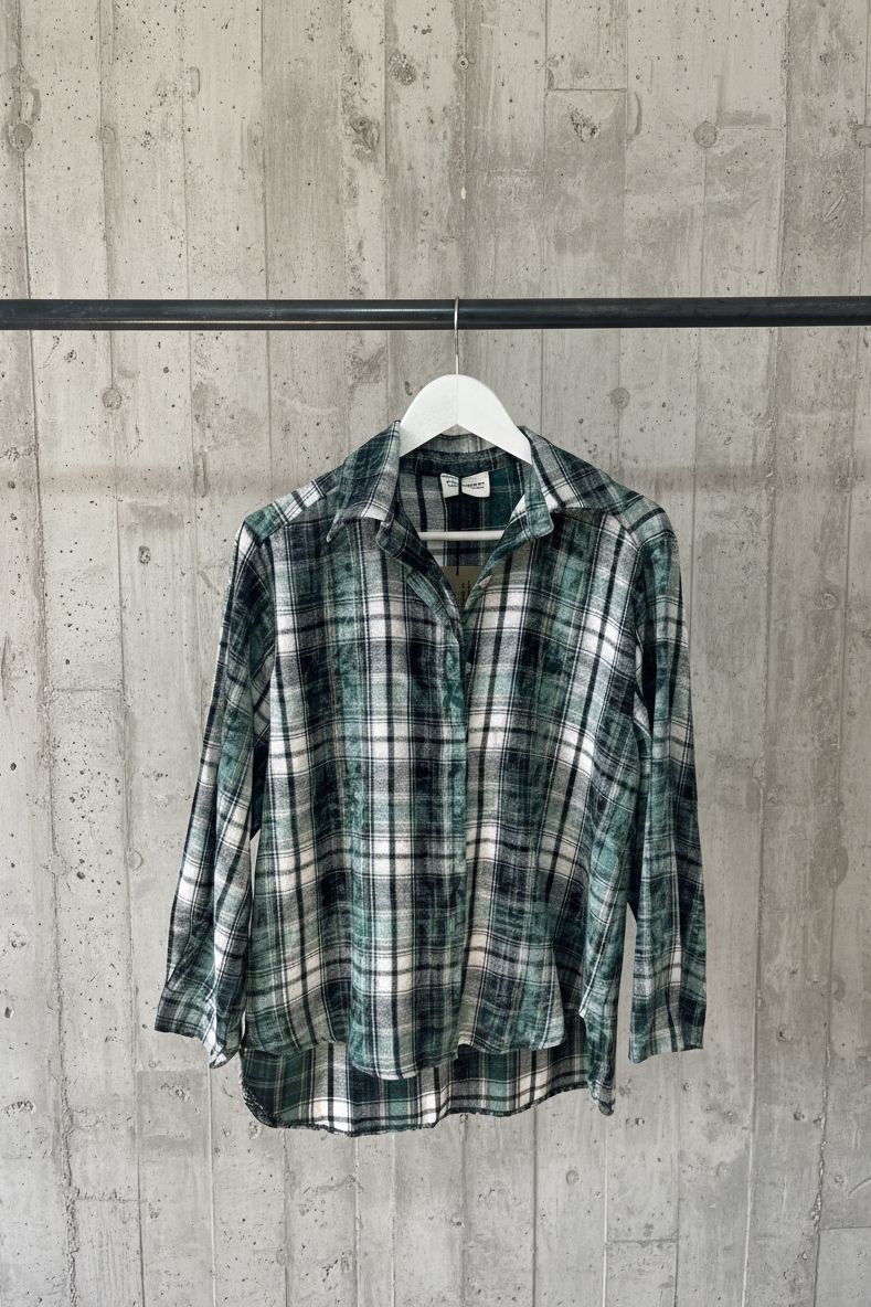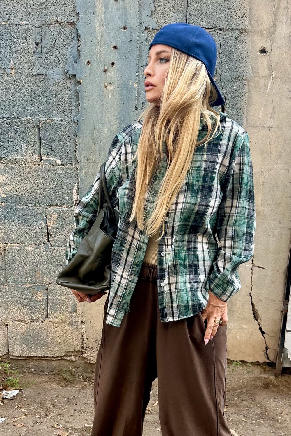 חולצת פלנל רכה בגזרת אוברסייז עם דוגמת משבצות בגווני בז’, חום ולבן, עשויה בד כותנה-פוליאסטר נעים למגע ונושם.