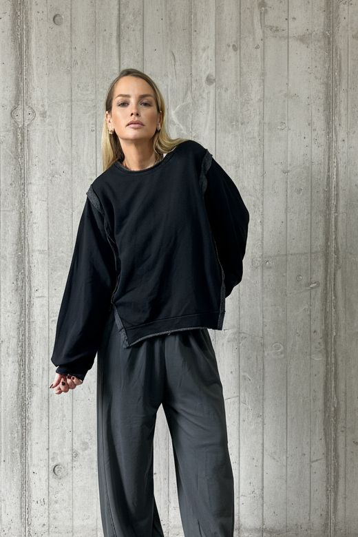 עשוי מבד כותנה רך ונעים, בגזרה מעט אוברסייז עם חיתוכים גולמיים ותפרים חשופים שמעניקים לו מראה מחוספס אך מתוחכם.