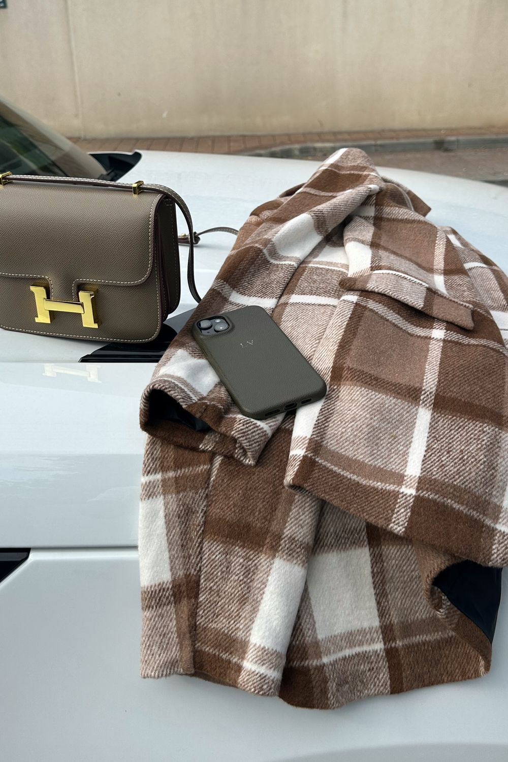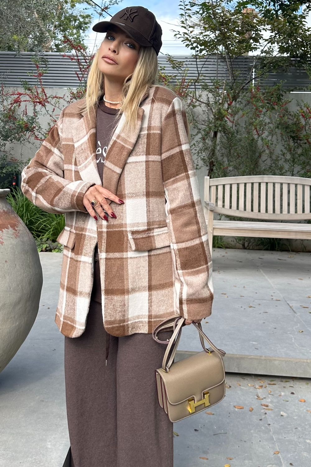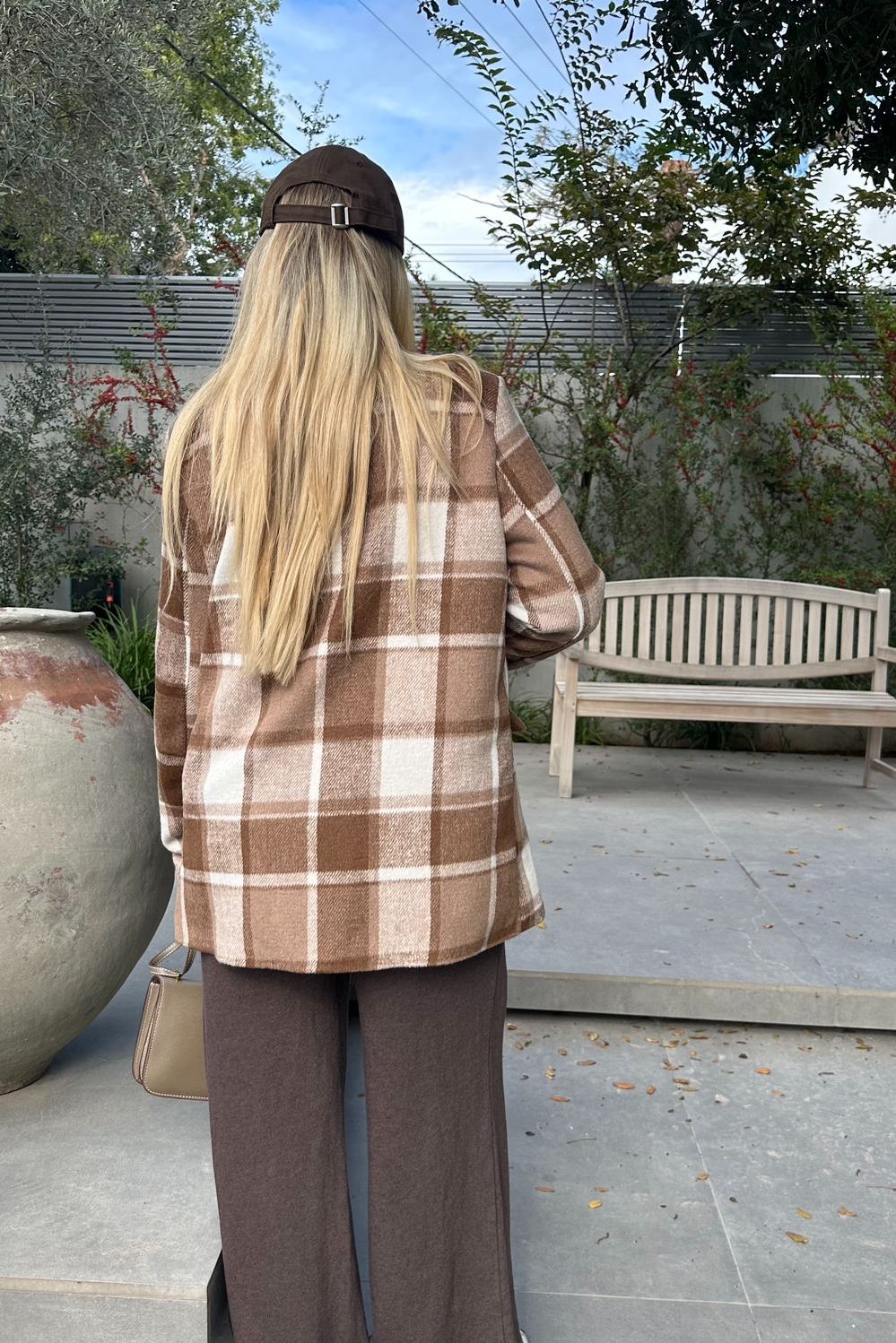 בדוגמת חום-לבן, בגזרה ישרה ונוחה. עשוי מבד צמרי מעט