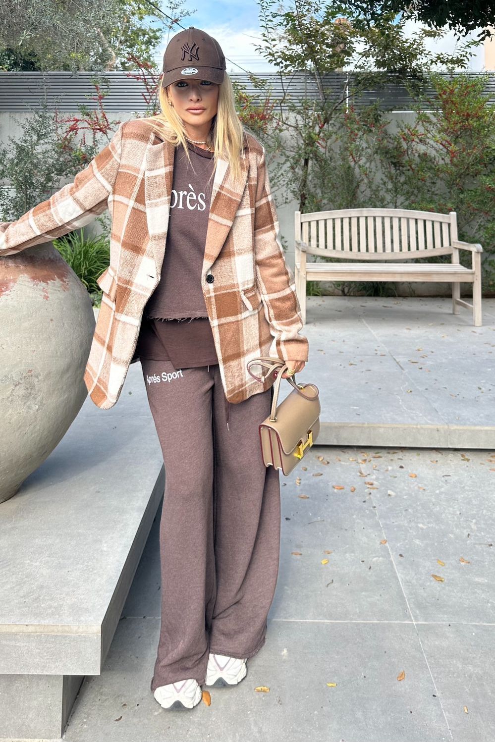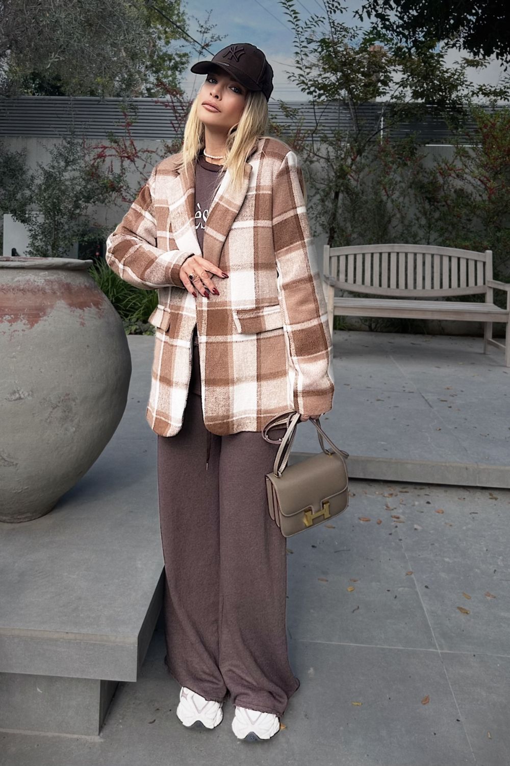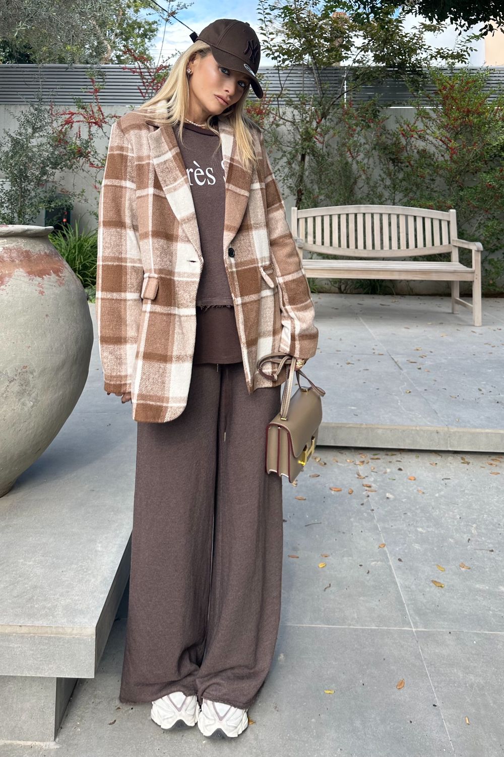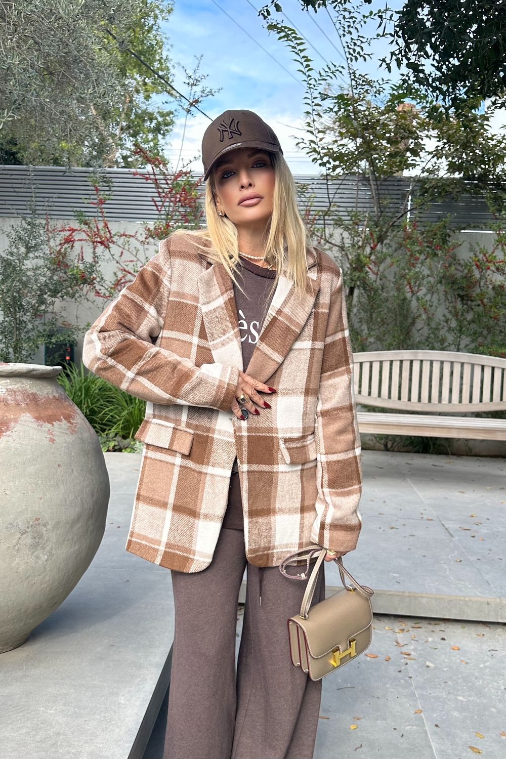 בדוגמת חום-לבן, בגזרה ישרה ונוחה. עשוי מבד צמרי מעט
