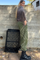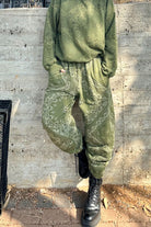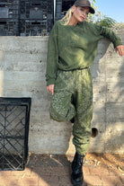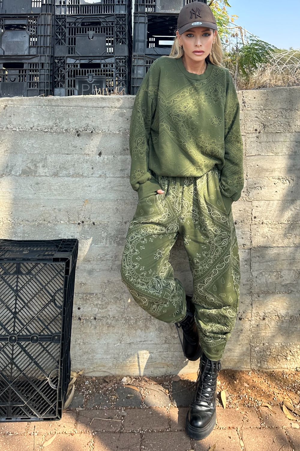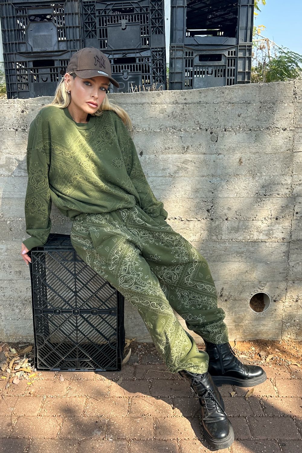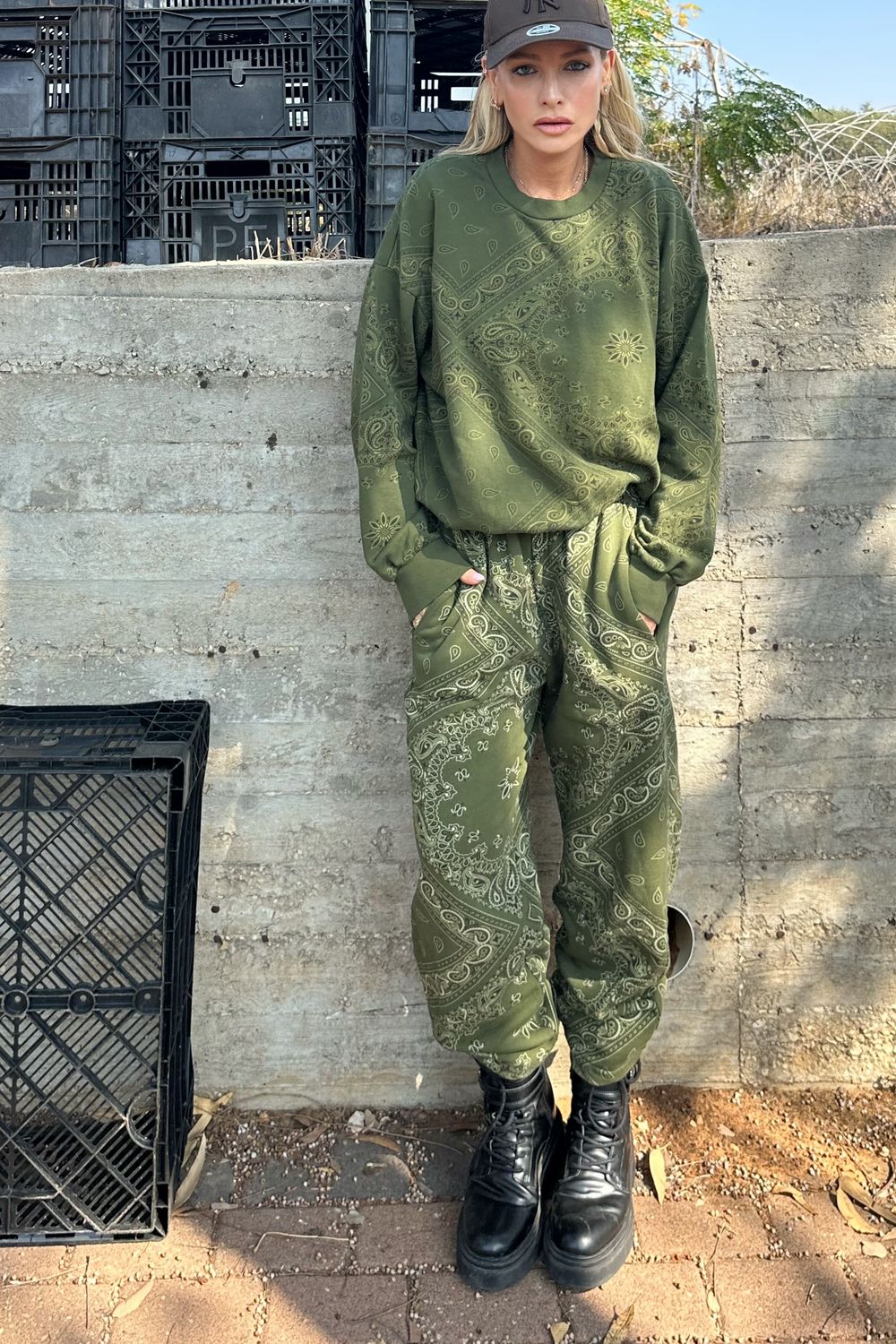 מכנס טרנינג דגם בנדנה גוון בורדו בגזרה משוחררת ונינוחה, עם הדפס בנדנה ייחודי לכל האורך לווייב אורבני ושיקי.