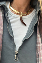 צ׳וקר ציפוי זהב נועז עם תליון קרן בצבע חום עמוק, משולב בשרשרת עבה ובחצי קולר מתכתי ליצירת מראה חזק ובולט.