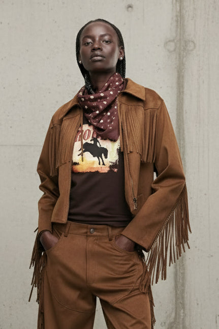 עשוי עור זמש רך ונעים למגע, עם פרנזים ארוכים בחזה ובשרוולים שמוסיפים תנועה, חופש וסטייטמנט לכל לוק.