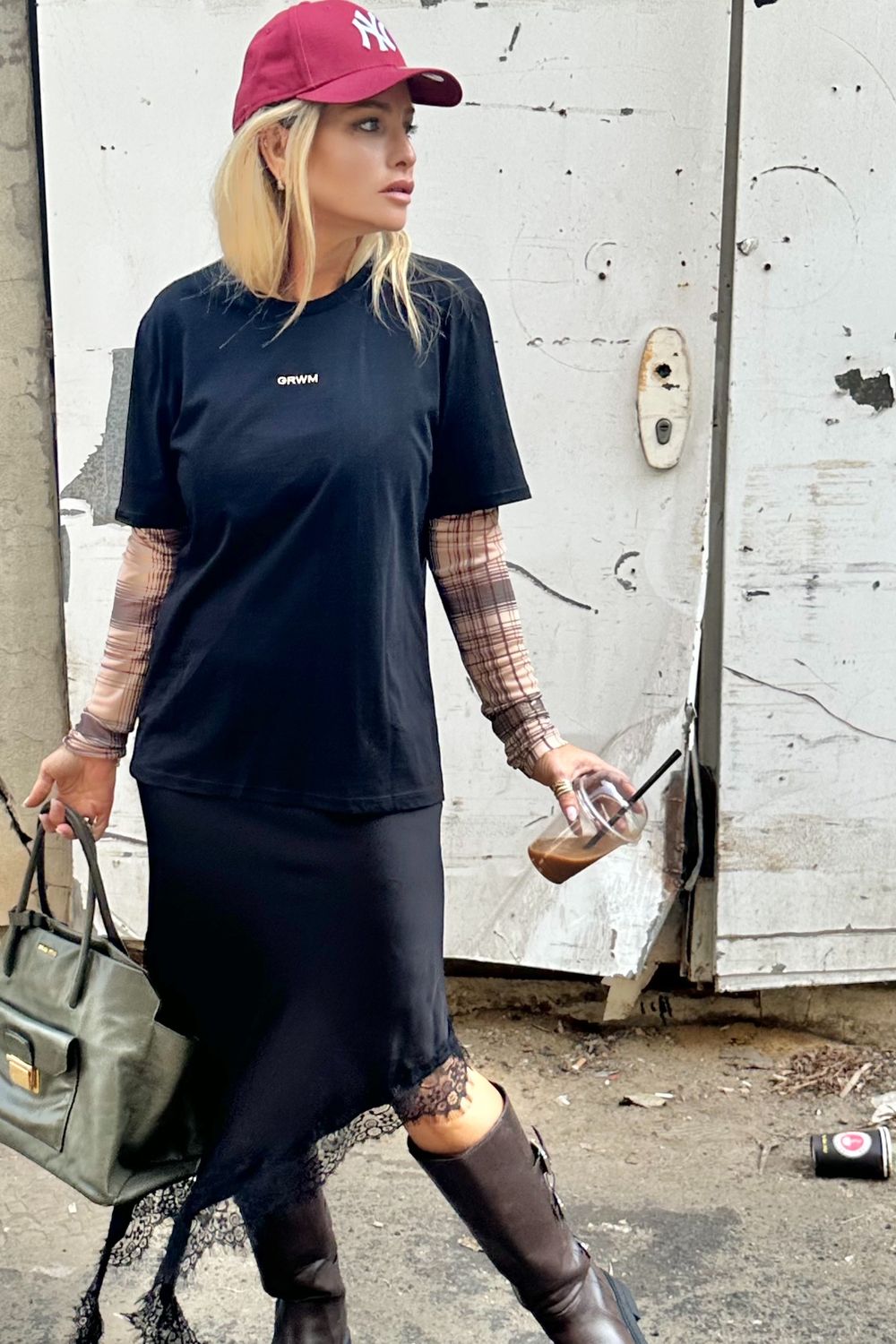 הדגם משלב מראה שכבות מתוחכם – טי שירט קצרה מעל שרוולים ארוכים בהדפס משבצות עדין, ליצירת לוק קז׳ואלי עם טוויסט אופנתי.
