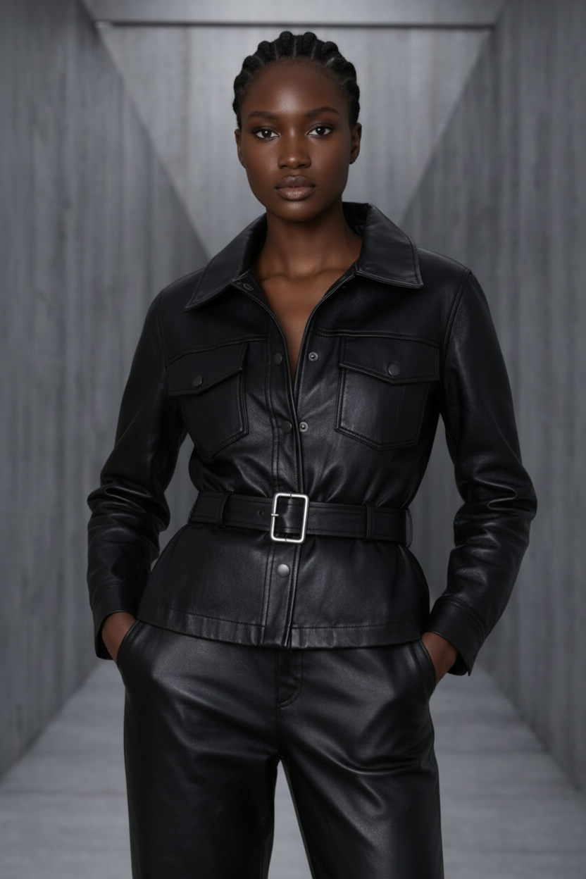 ג׳קט VEGAN LEATHER עם חגורה – גזרה טרנדי־מחויטת