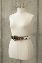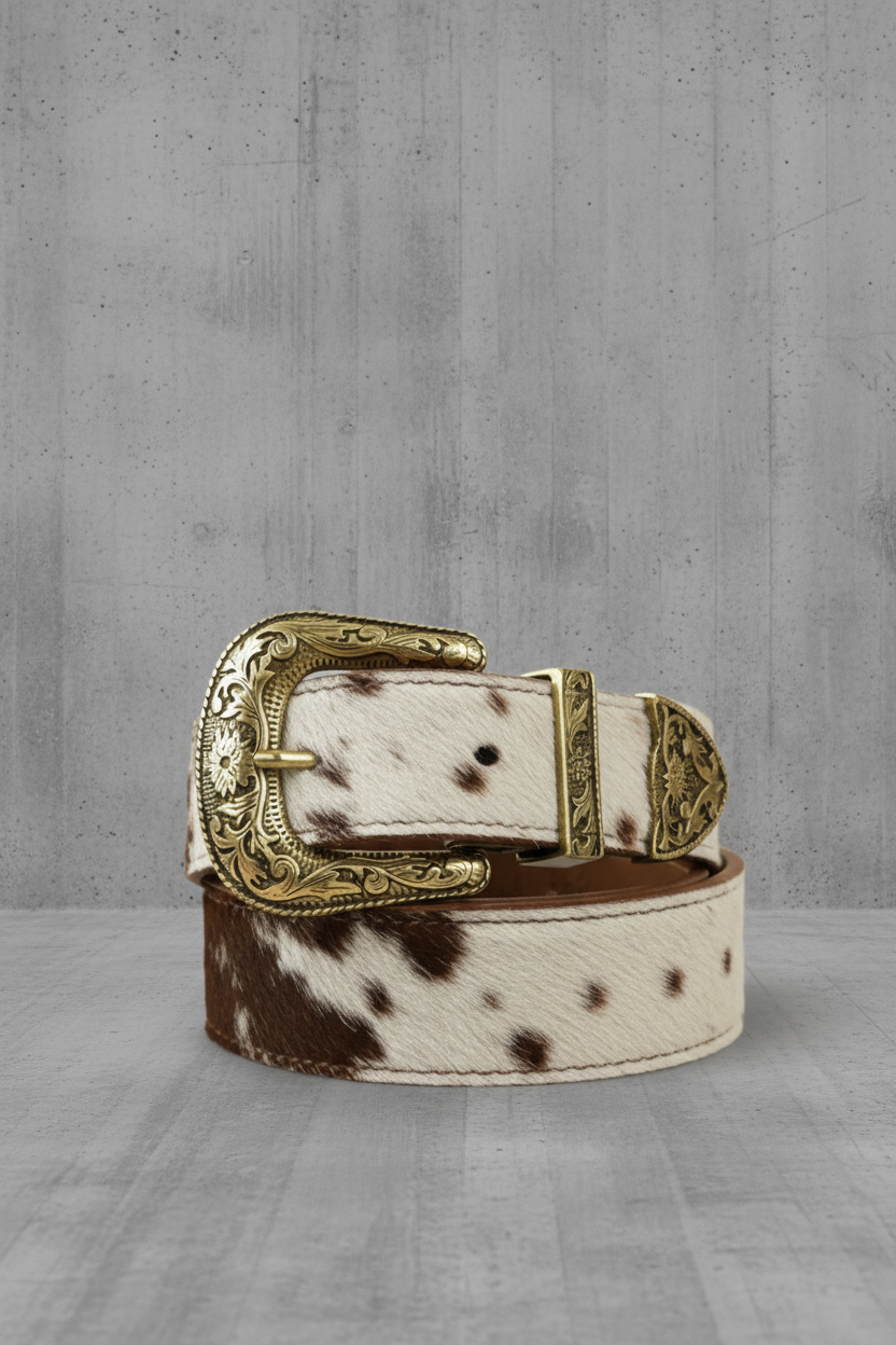 חגורה עשויה עור טבעי בגוון חום עם טקסטורה של פרווה עדינה, בשילוב אבזם מתכתי עגול במראה וינטג’ מחוספס.