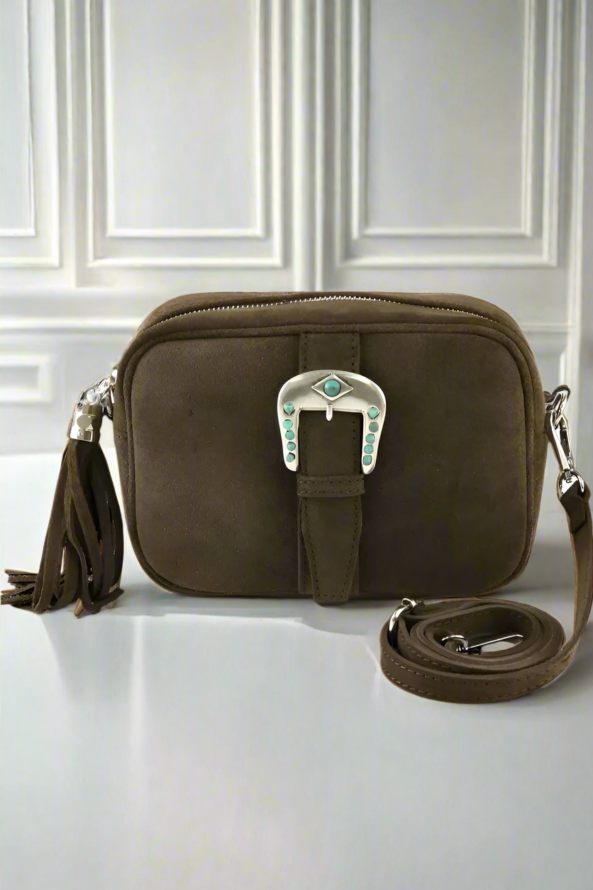 הדיטייל המרכזי – אבזם כסף מעוטר באבנים טורקיז עדינות – מעניק לתיק אופי ייחודי ושיק מערבי-אלגנטי.