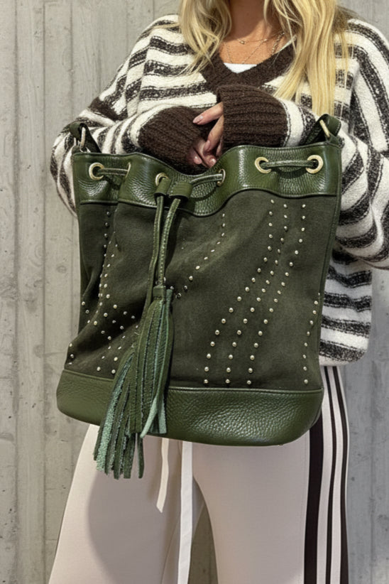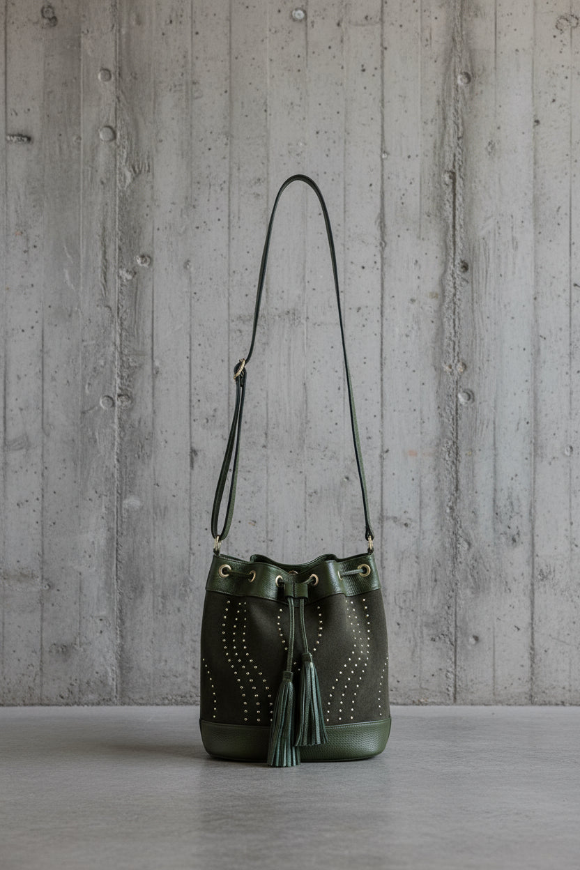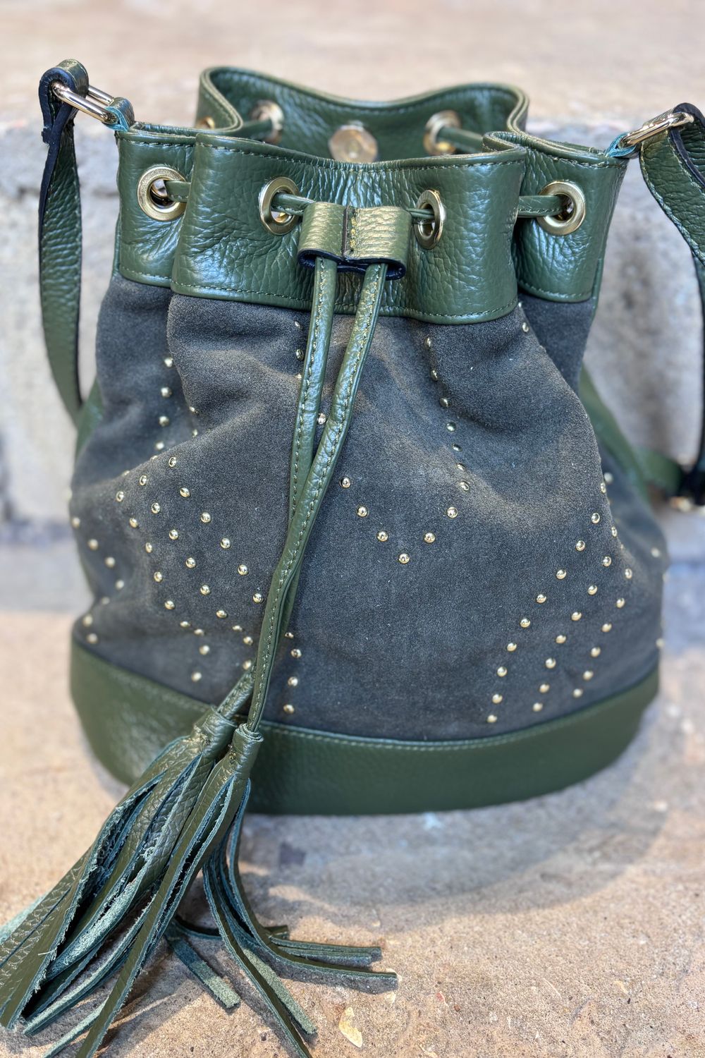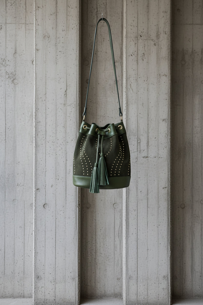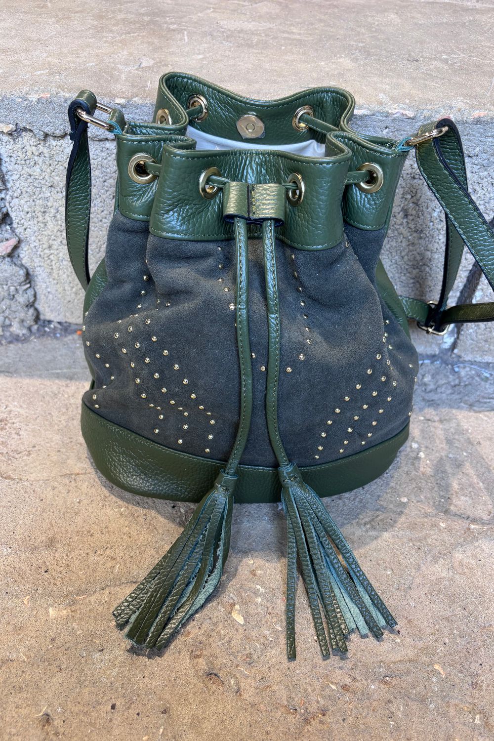תיק מעור וסוויד בגוון ירוק עמוק, בעיצוב בוהו־שיק עם ניטים עדינים ושרוכים מתכווננים בסגירה עליונה.