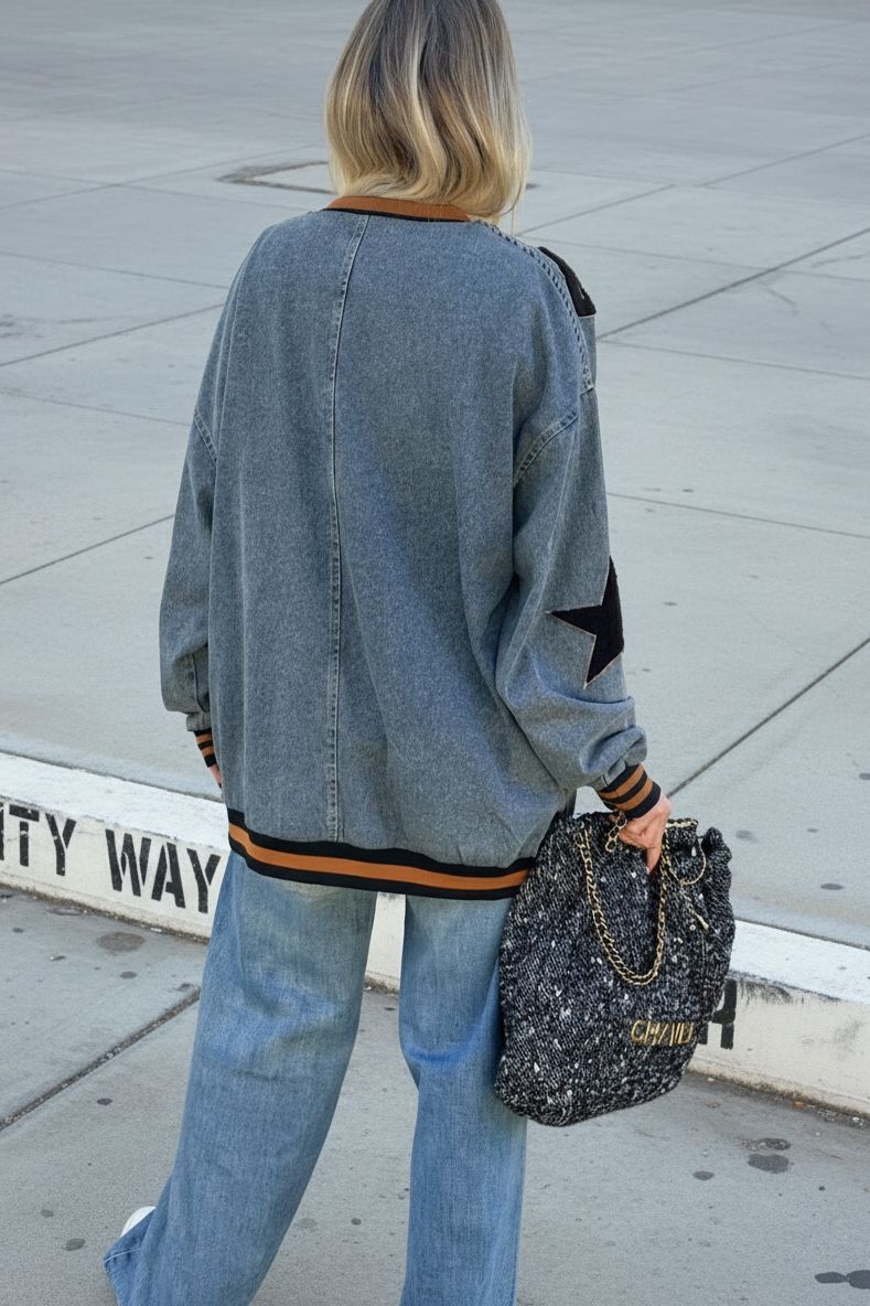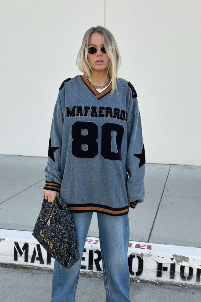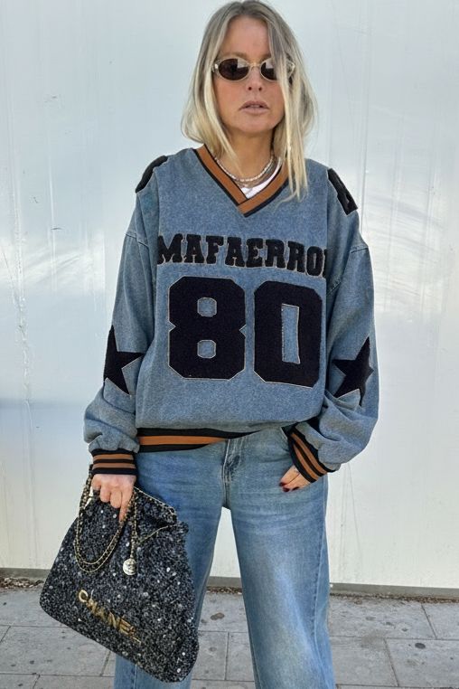 סווטשירט אוברסייז מבד ג’ינס רך, בגזרת V מחמיאה עם הדפס קדמי וסיומות ריב.
