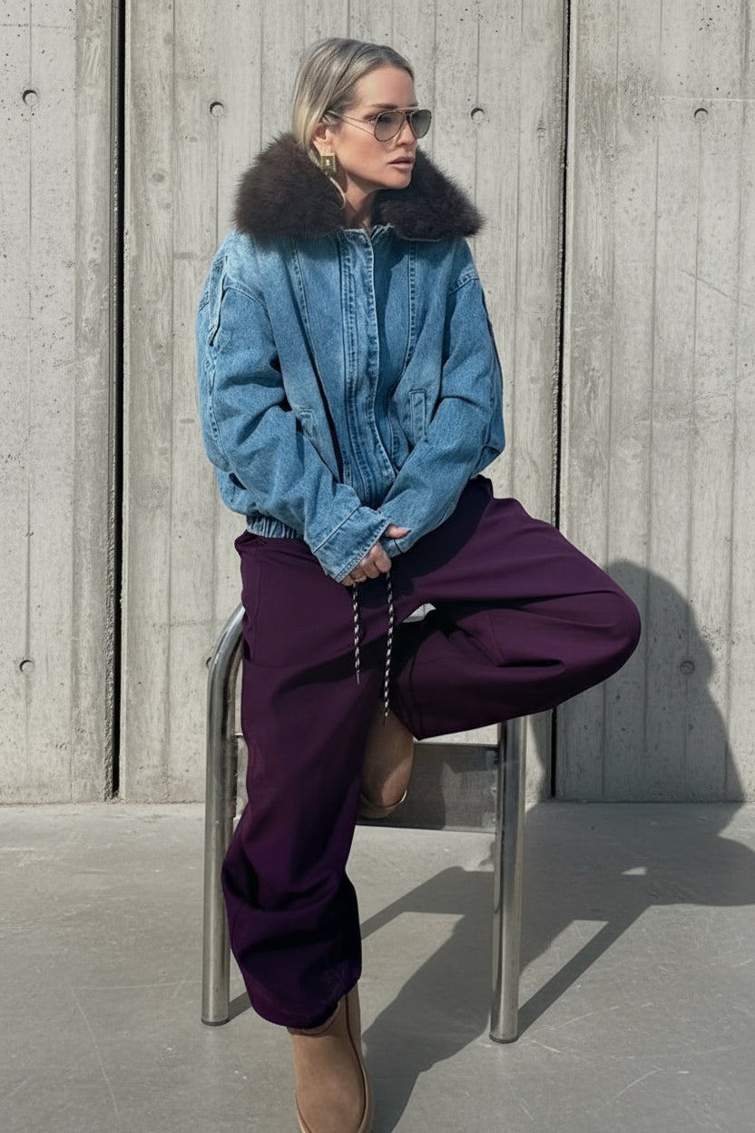 ג׳קט ג׳ינס ייחודי עם צווארון פרווה דרמטי ומגע יוקרתי.