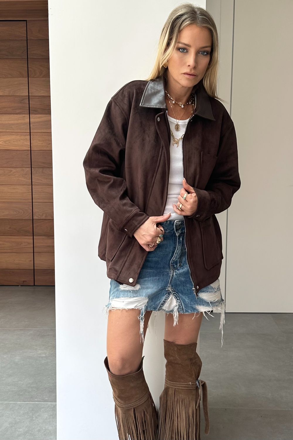 ג׳קט זמש מפנק ורך למגע, בגזרת אוברסייז מחמיאה שמתאימה למידות S-L.