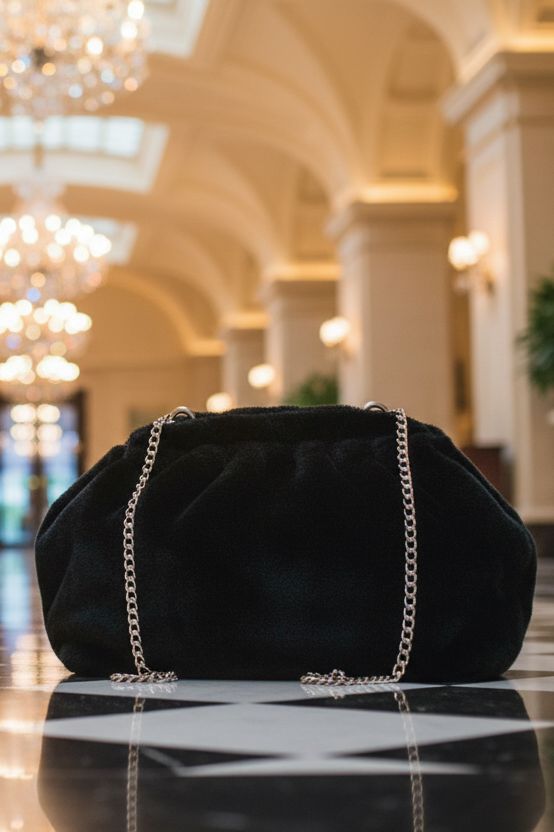 תיק ערב מפנק ומלא סטייל, עשוי פרווה שחורה רכה במראה יוקרתי ואלגנטי.