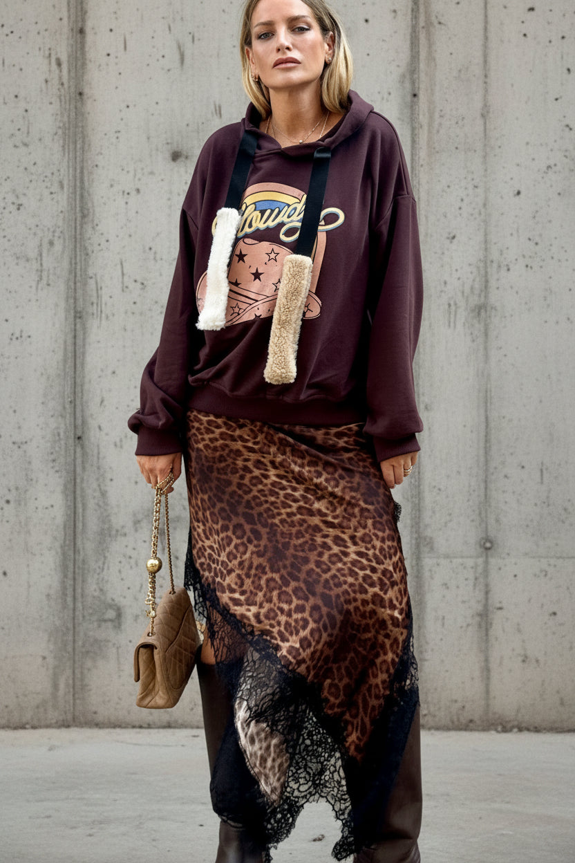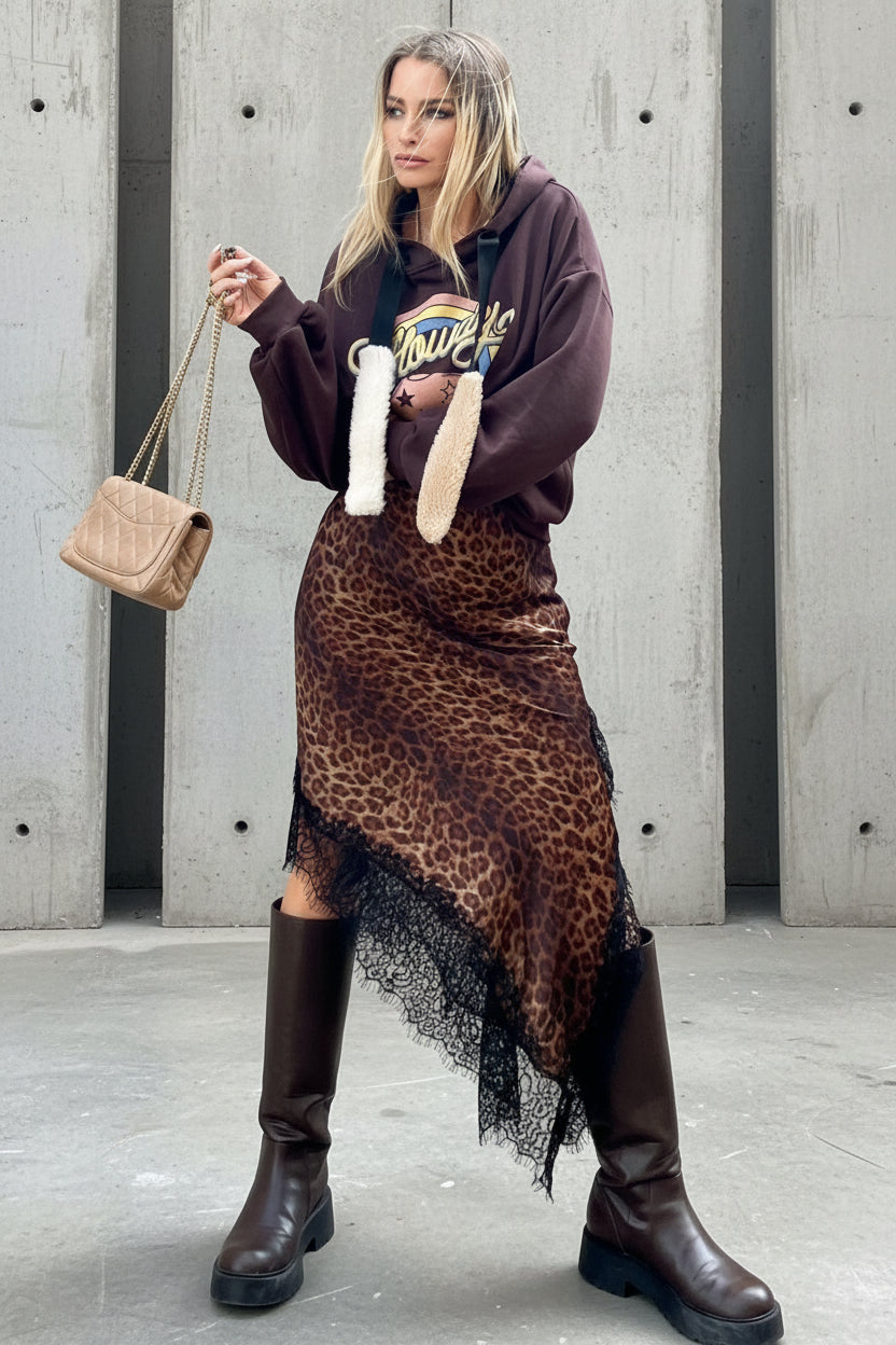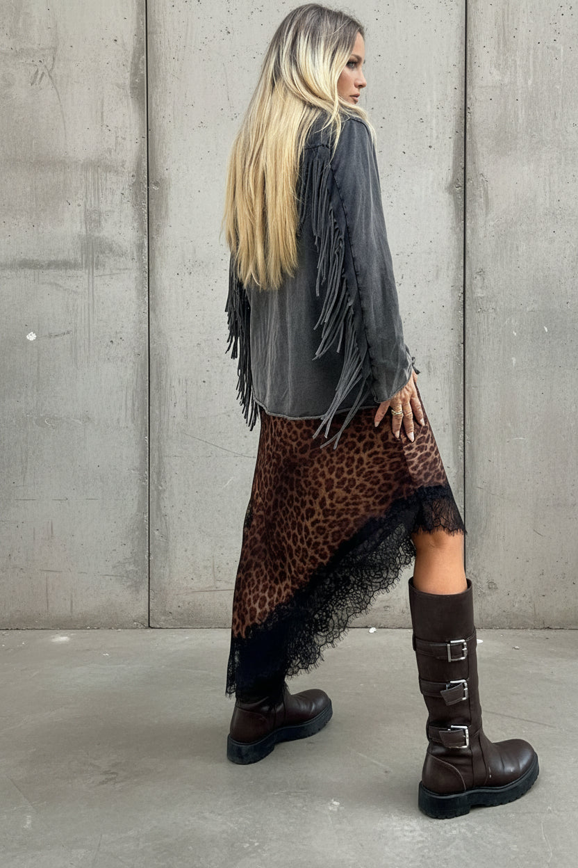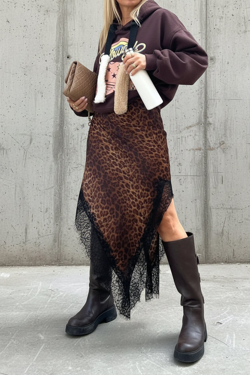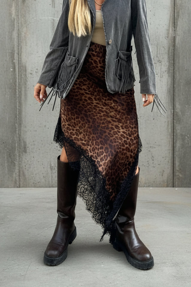 חצאית סאטן מנומרת במראה משי יוקרתי עם פסי תחרה שחורה עדינה בקצה.